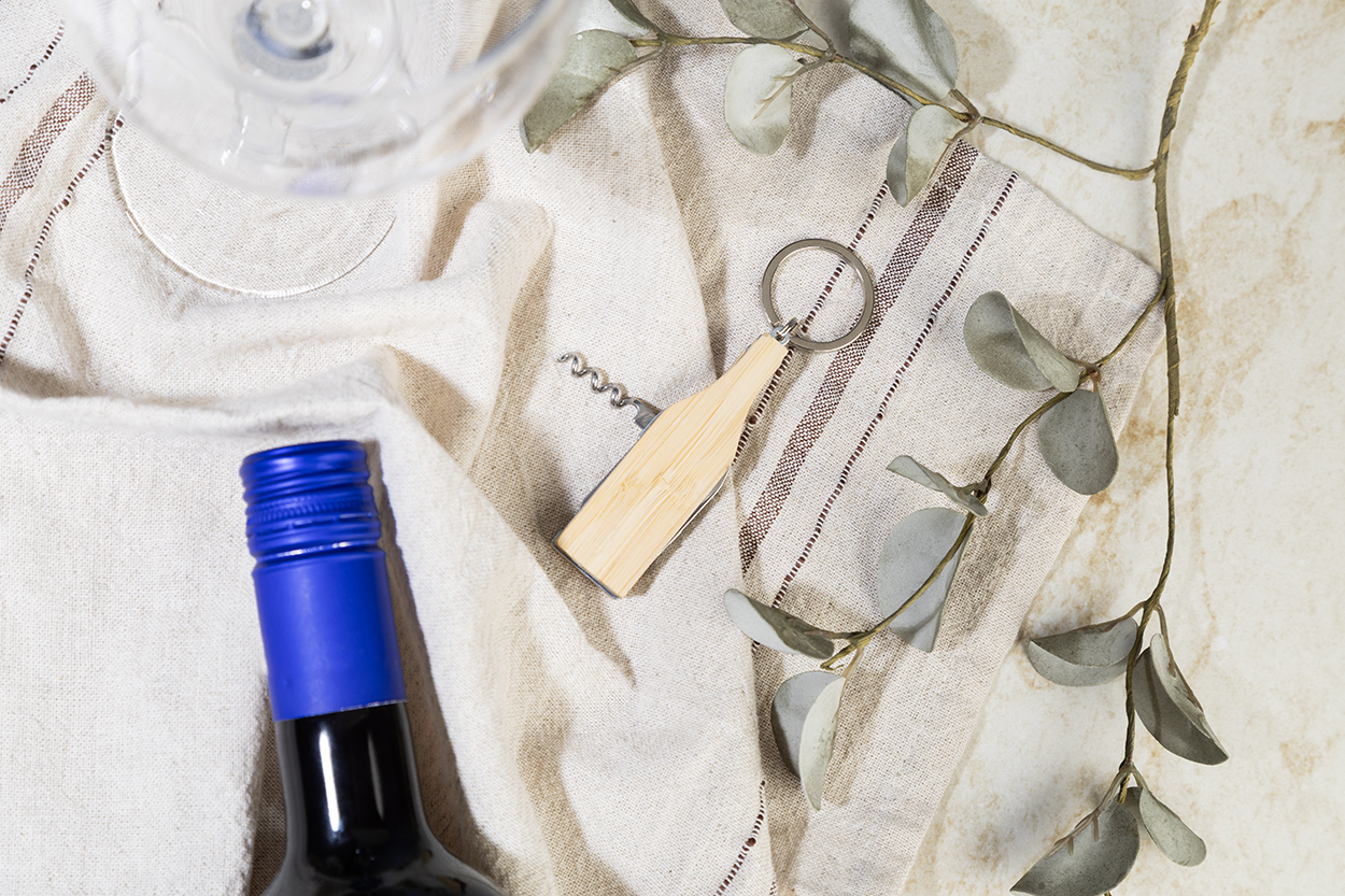 Multifunkční přívěšek na klíče ve tvaru lahve z nerezové oceli a bambusu. Se 4 funkcemi: nůž, vývrtka, otvírák na lahve a pilník.
