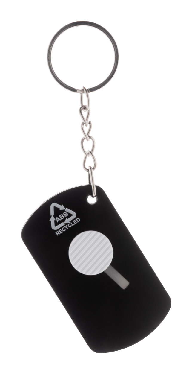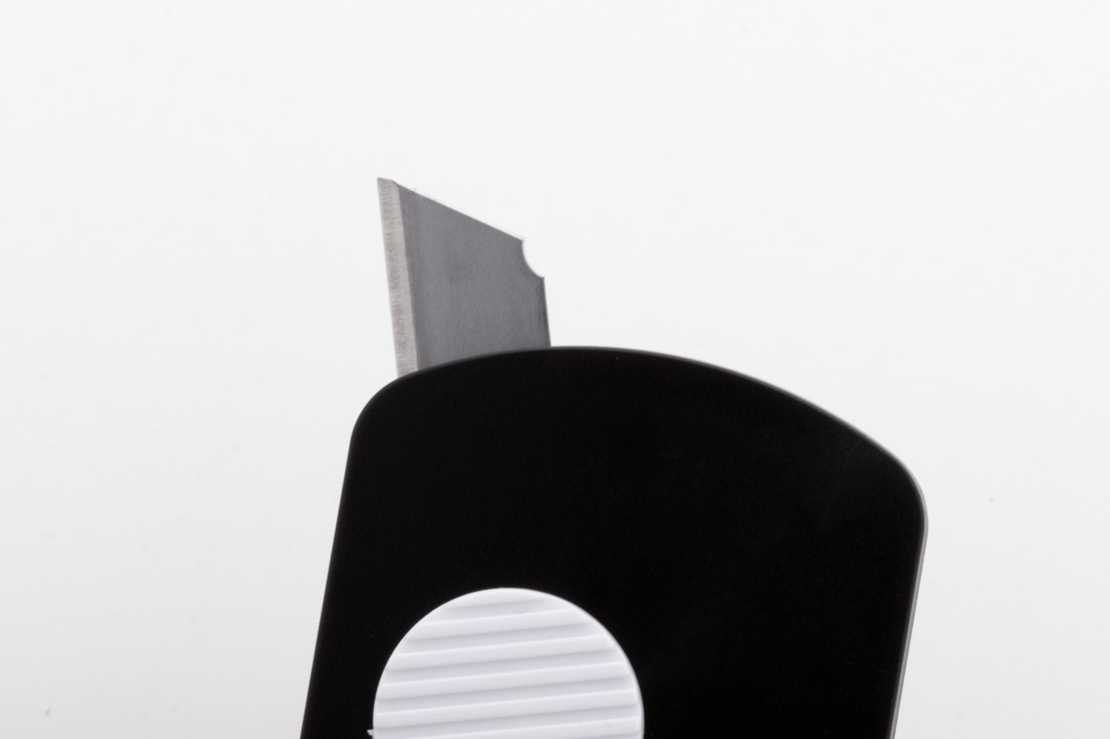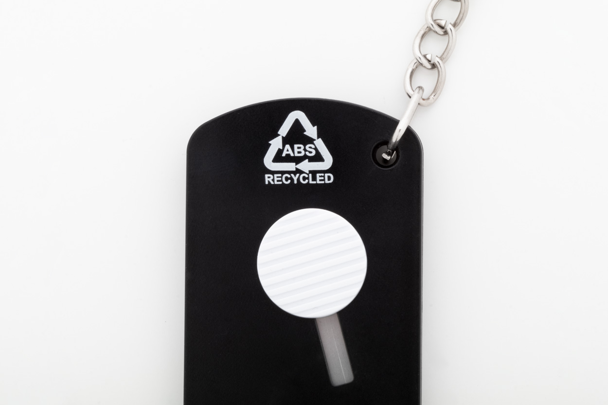 Nůž na papír z recyklovaného ABS plastu a nerezové oceli se samonavíjecí čepelí a kovovým kroužkem na klíče.