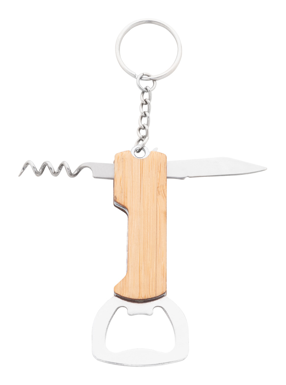 Přívěšek na klíče s otvírákem na láhve z bambusu a nerezové oceli s vývrtkou a kapesním nožem.