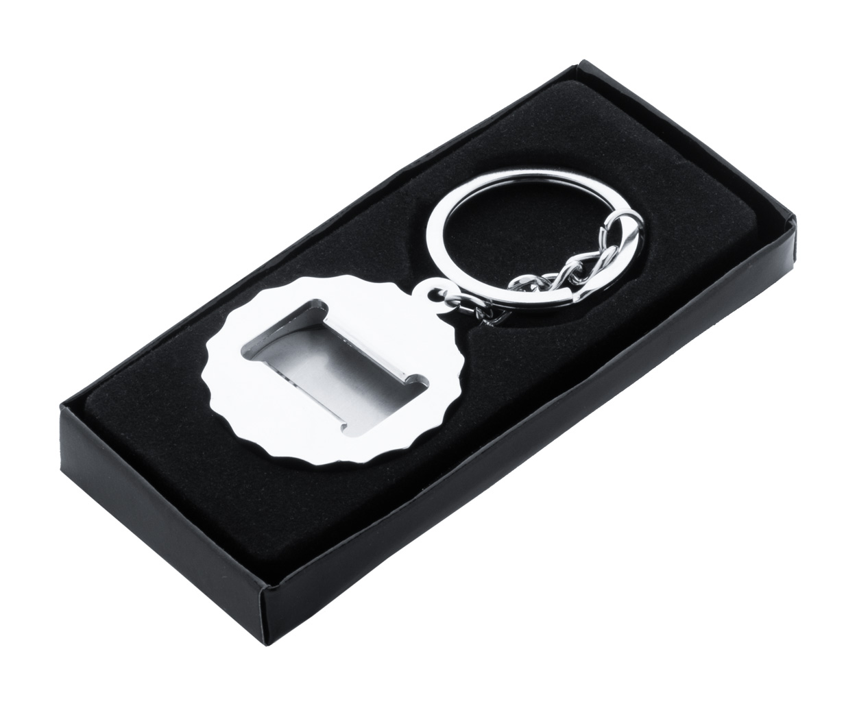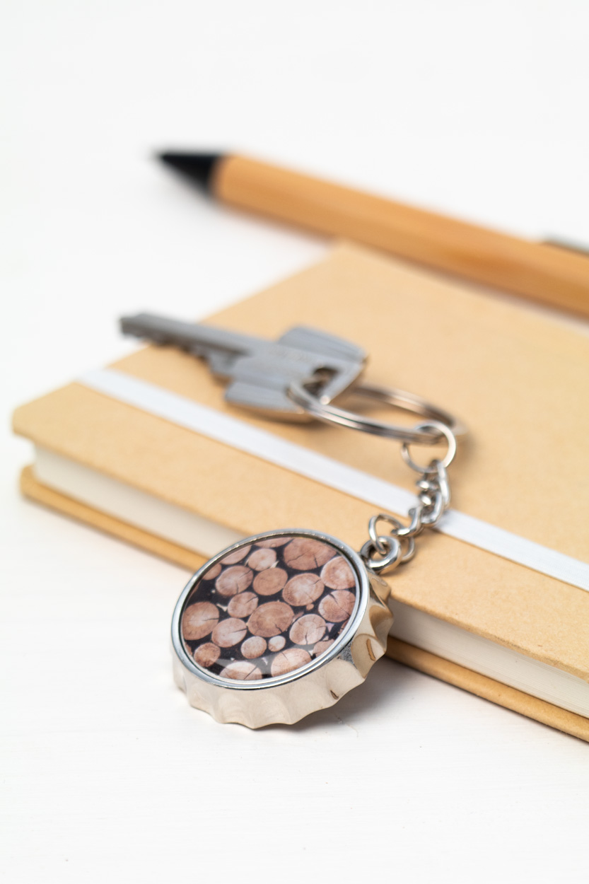 Kovový přívěsek na klíče ve tvaru uzávěru s otvírákem na láhve. V černé dárkové krabičce. Ideální pro epoxy tisk.