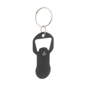 Přívěšek na klíče s otvírákem na láhve z recyklovaného hliníku s žetonem do nákupního vozíku.