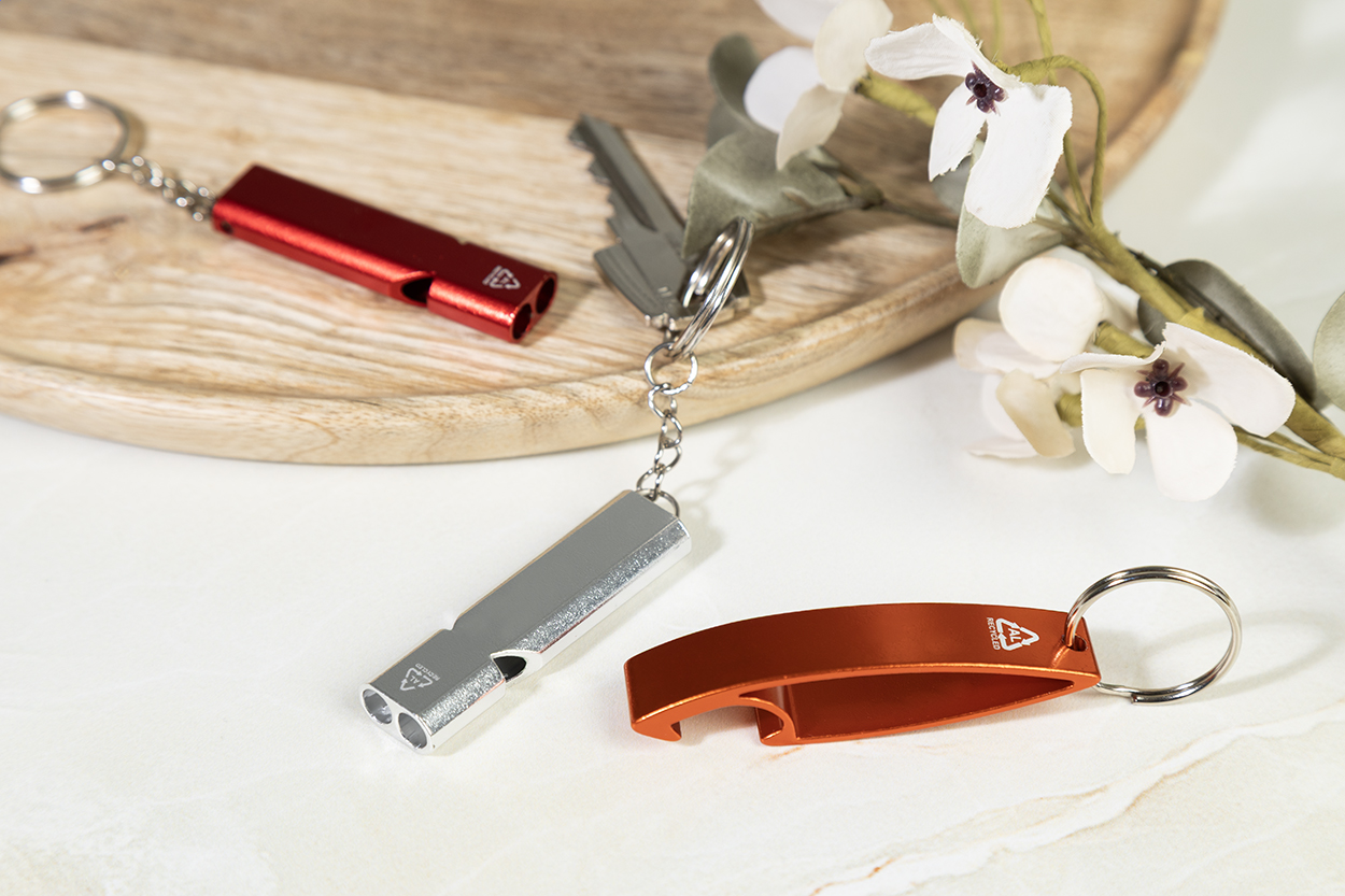 Otvírák na lahve z recyklovaného hliníku s kovovým kroužkem na klíče.