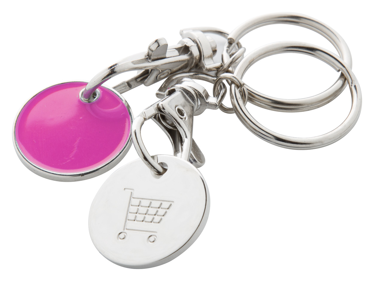 Kovový přívěšek na klíče se žetonem do nákupního košíku. Jedna strana mince je barevná, na druhé je vyražen nákupní vozík. Velikost: ø23×1,7 mm.