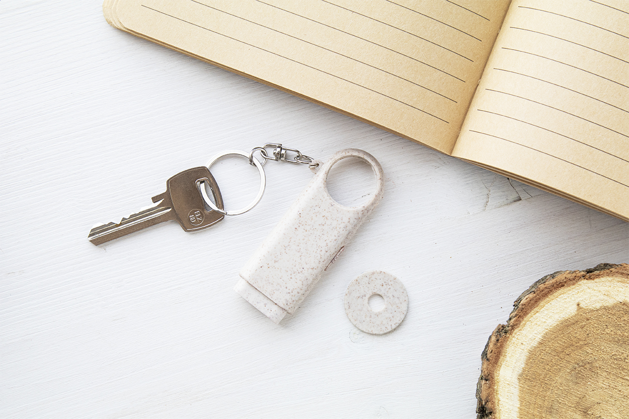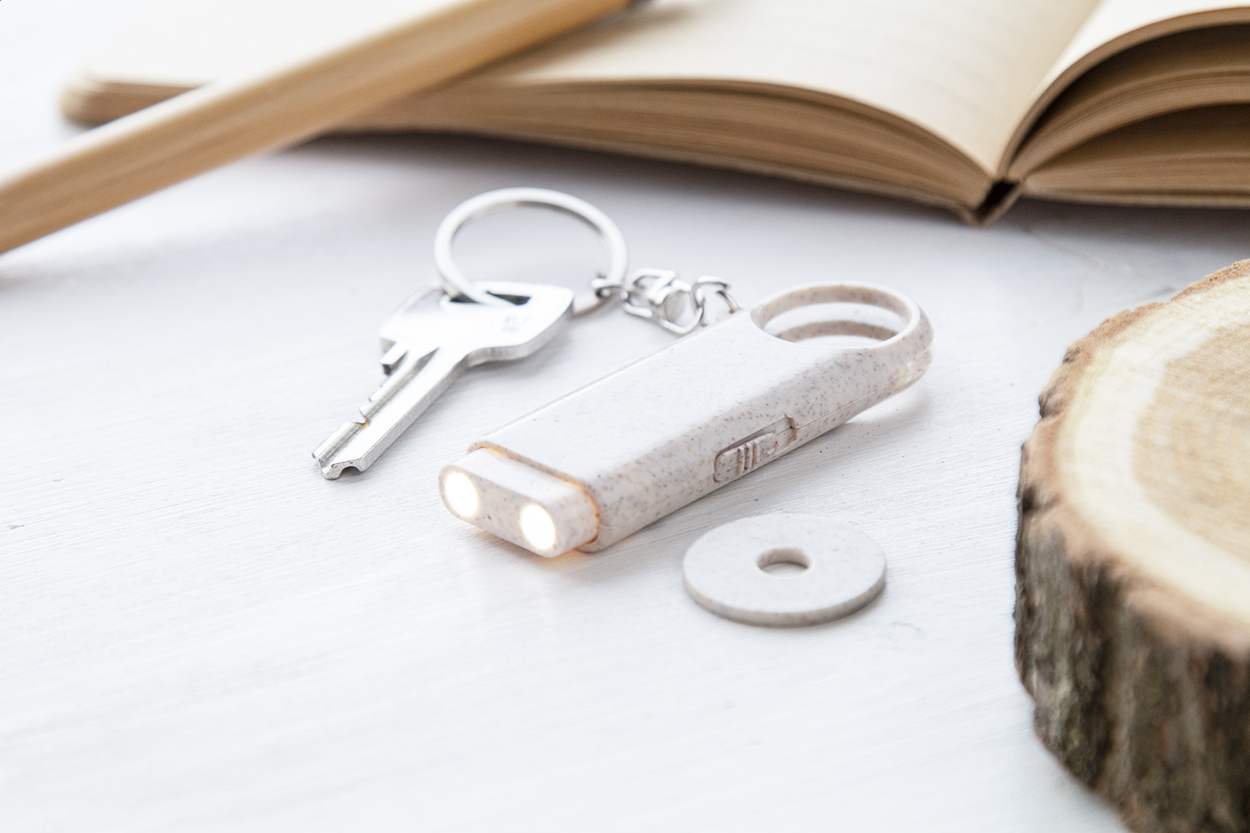 Přívěšek na klíče z ekologického plastu ze slámy se žetonem do vozíku a 2 LED světly. Dodáváno se 2 knoflíkovými bateriemi.