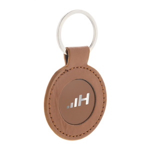 Kulatý přívěsek na klíče z recyklované PU kůže s kovovým kroužkem a nerezovou destičkou s logem a pogumovanou úpravou. Se speciálním povrchem pro zrcadlové laserové gravírování.