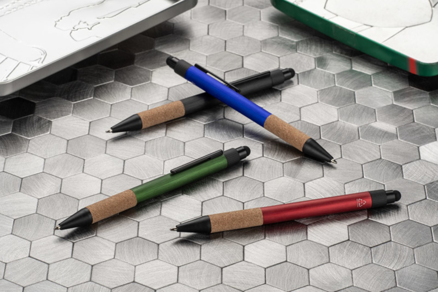 Kuličkové pero BOSAY vyrobené z recyklovaného hliníku. Matná barva v kombinaci s korkovou rukojetí vypadá jedinečně a originálně. Vyznačuje se lehkostí a pohodlím psaní.
