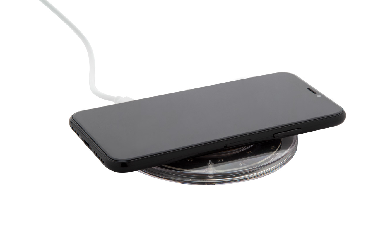 Bezdrátová rychlonabíječka (15W) v průhledném plastovém a bambusovém pouzdře s viditelnými elektronickými součástkami. Včetně USB nabíjecího kabelu.
