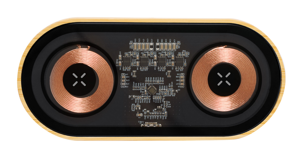 Dvoucívková bezdrátová rychlonabíječka (15W) v bambusovém a průhledném plastovém krytu s viditelnými elektronickými součástkami. Včetně USB nabíjecího kabelu.