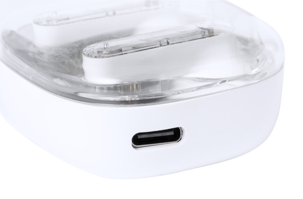 Poloprůhledná, bezdrátová bluetooth sluchátka s viditelnými elektronickými součástkami a funkcí hands-free volání. V poloprůhledném plastovém pouzdře nabíječky. Včetně USB nabíjecího kabelu.