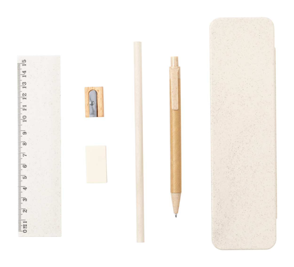 5ks psací sada. Včetně plastového pouzdra na tužky z pšeničné slámy, 1 dřevěné tužky, 1 recyklovaného papíru a plastového kuličkového pera z pšeničné slámy s modrou náplní, 1 pravítka (15 cm), 1 dřevěného ořezávátka a 1 gumy.