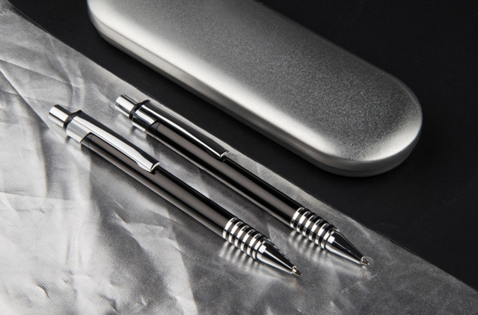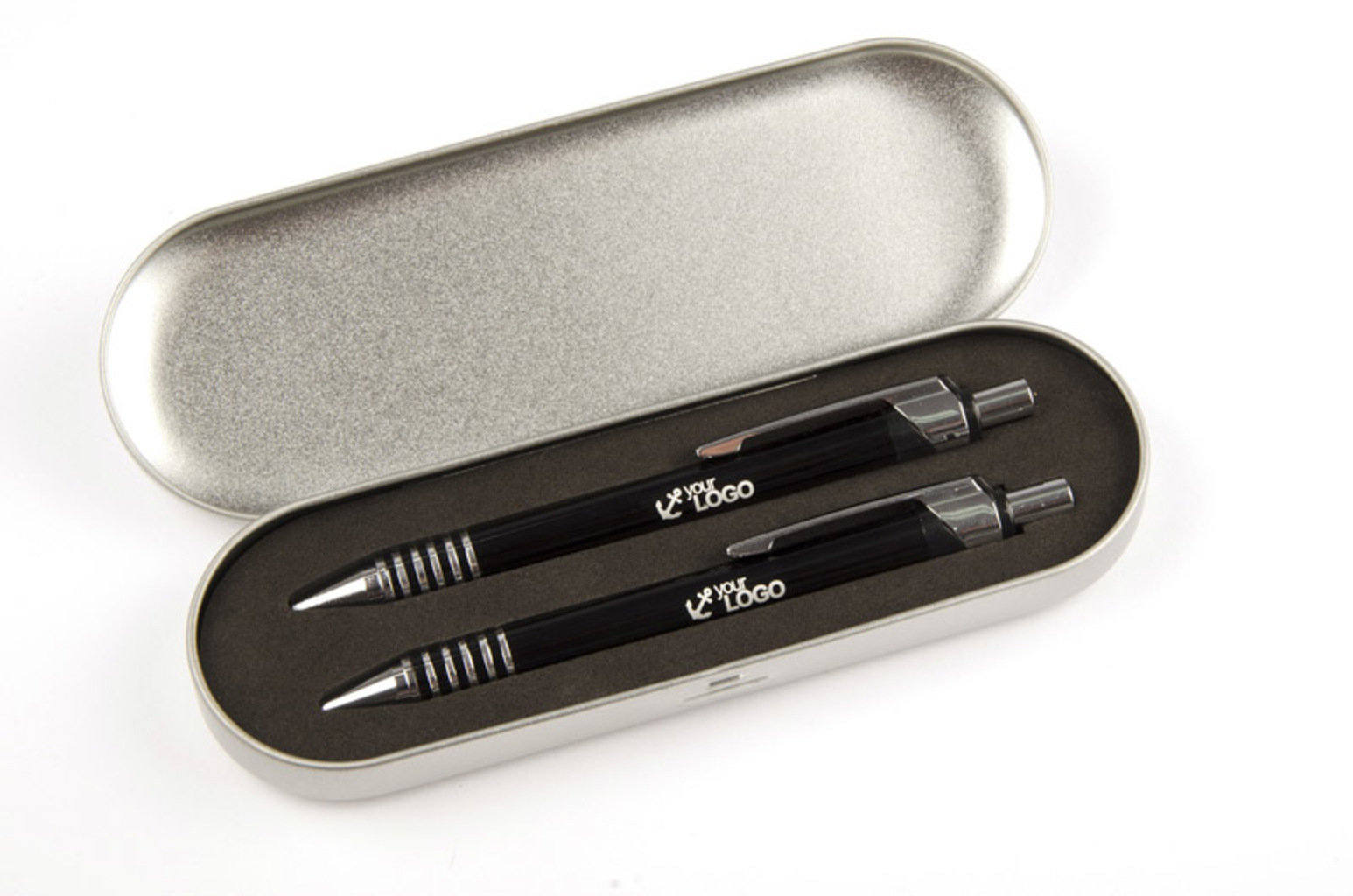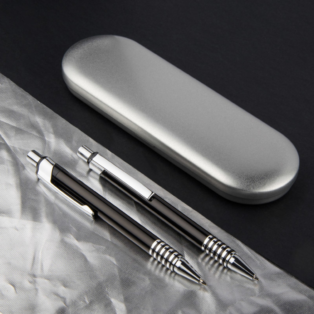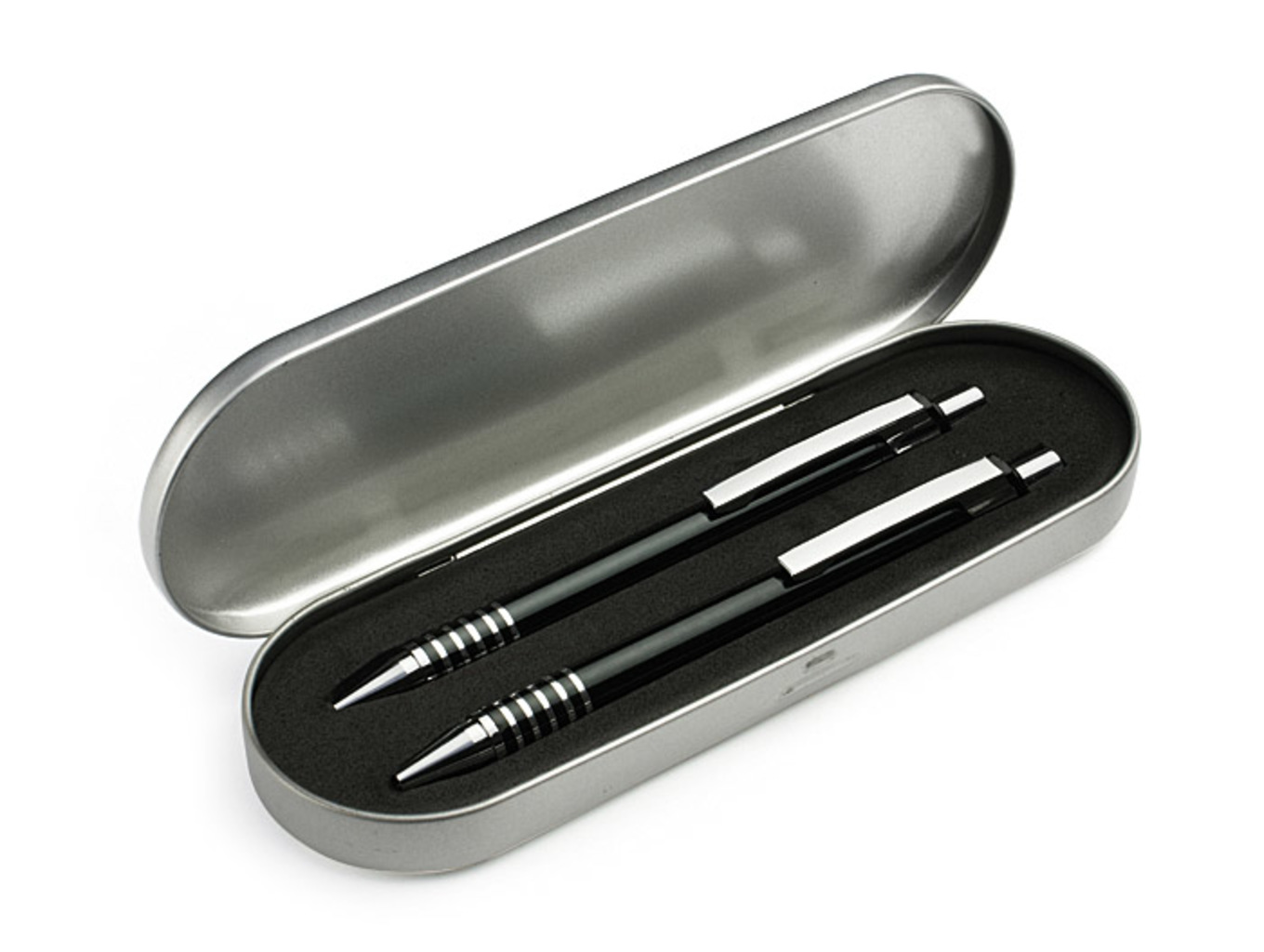 Sada psaní DAKOTA obsahuje pero a automatickou tužku. Obojí je baleno v praktickém kovovém pouzdře. Logo může být vyryto na obalu i na sadě.