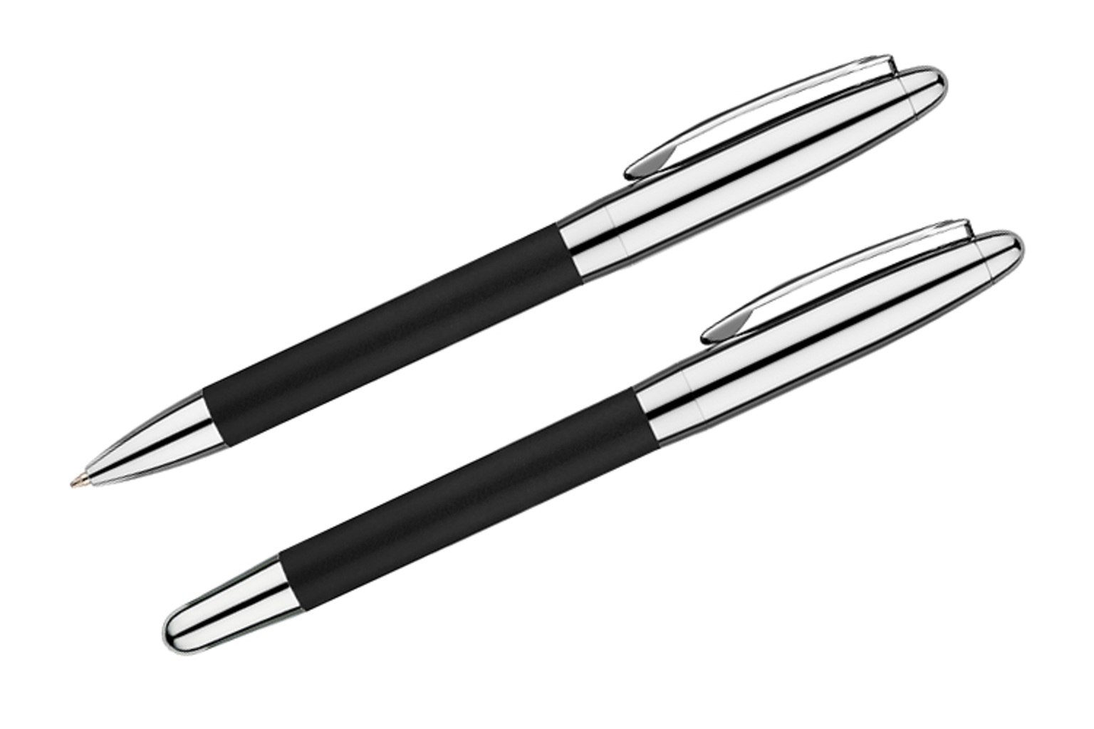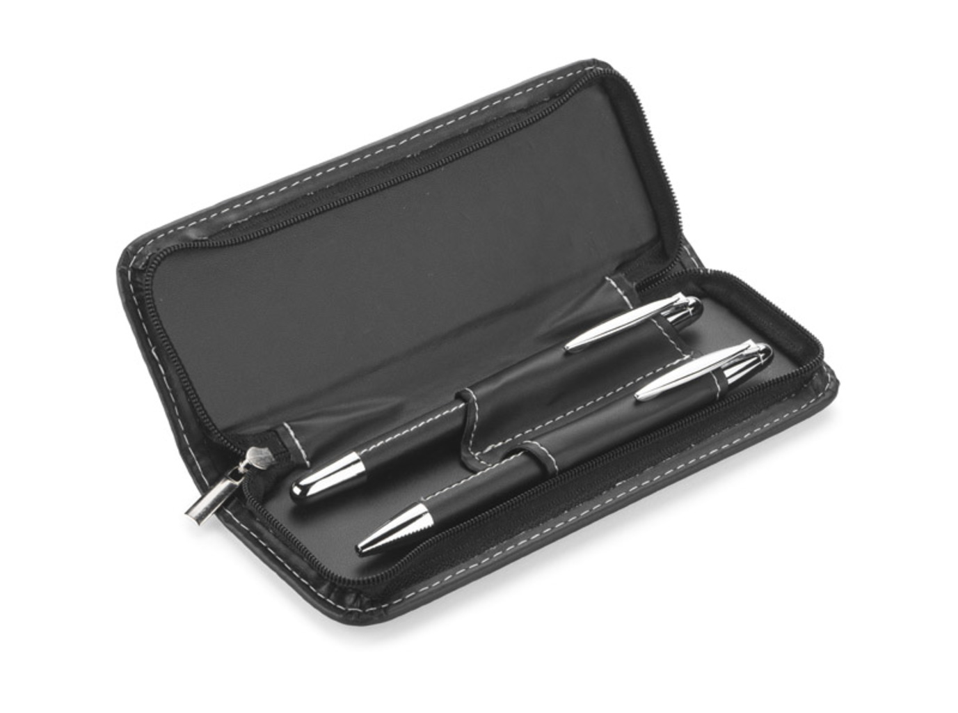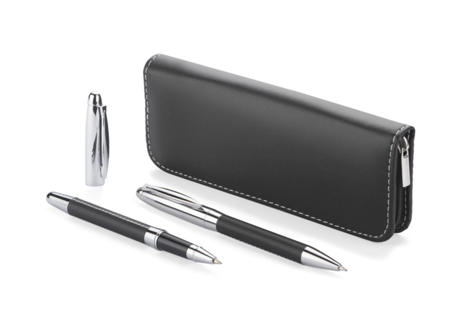 Psací souprava: kuličkové pero a roller v pouzdře z materiálu podobného kůži (PU). Kuličkové pero a roller s modrými inkoustovými náplněmi. Na psací potřeby vám laserem vygravírujeme vaše logo.