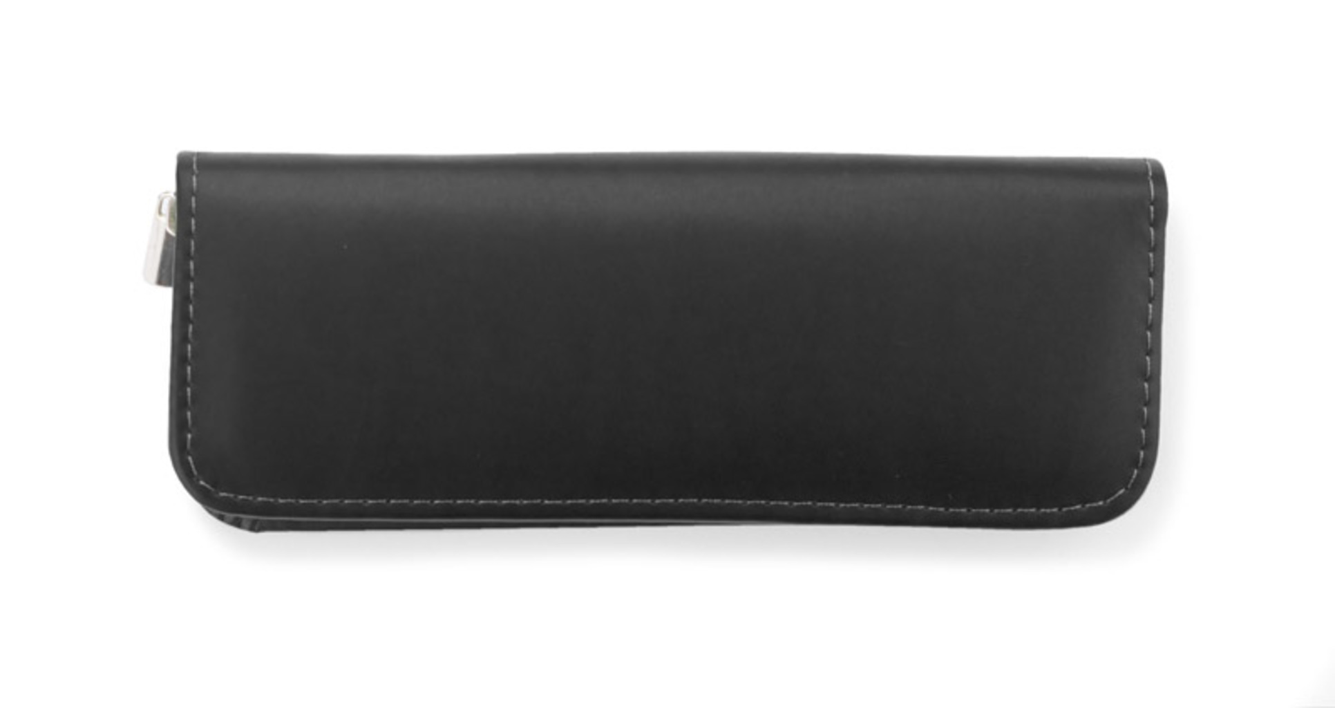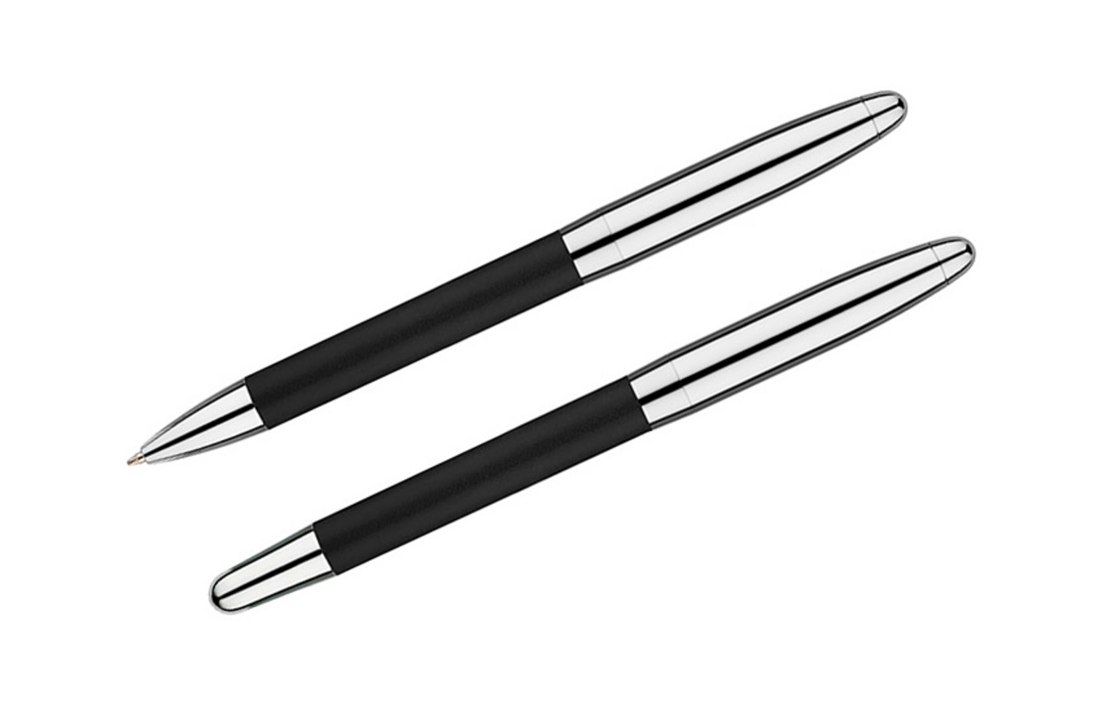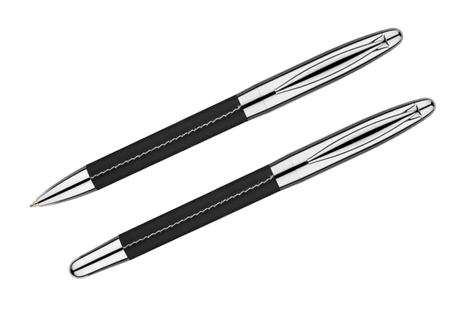 Psací souprava: kuličkové pero a roller v pouzdře z materiálu podobného kůži (PU). Kuličkové pero a roller s modrými inkoustovými náplněmi. Na psací potřeby vám laserem vygravírujeme vaše logo.