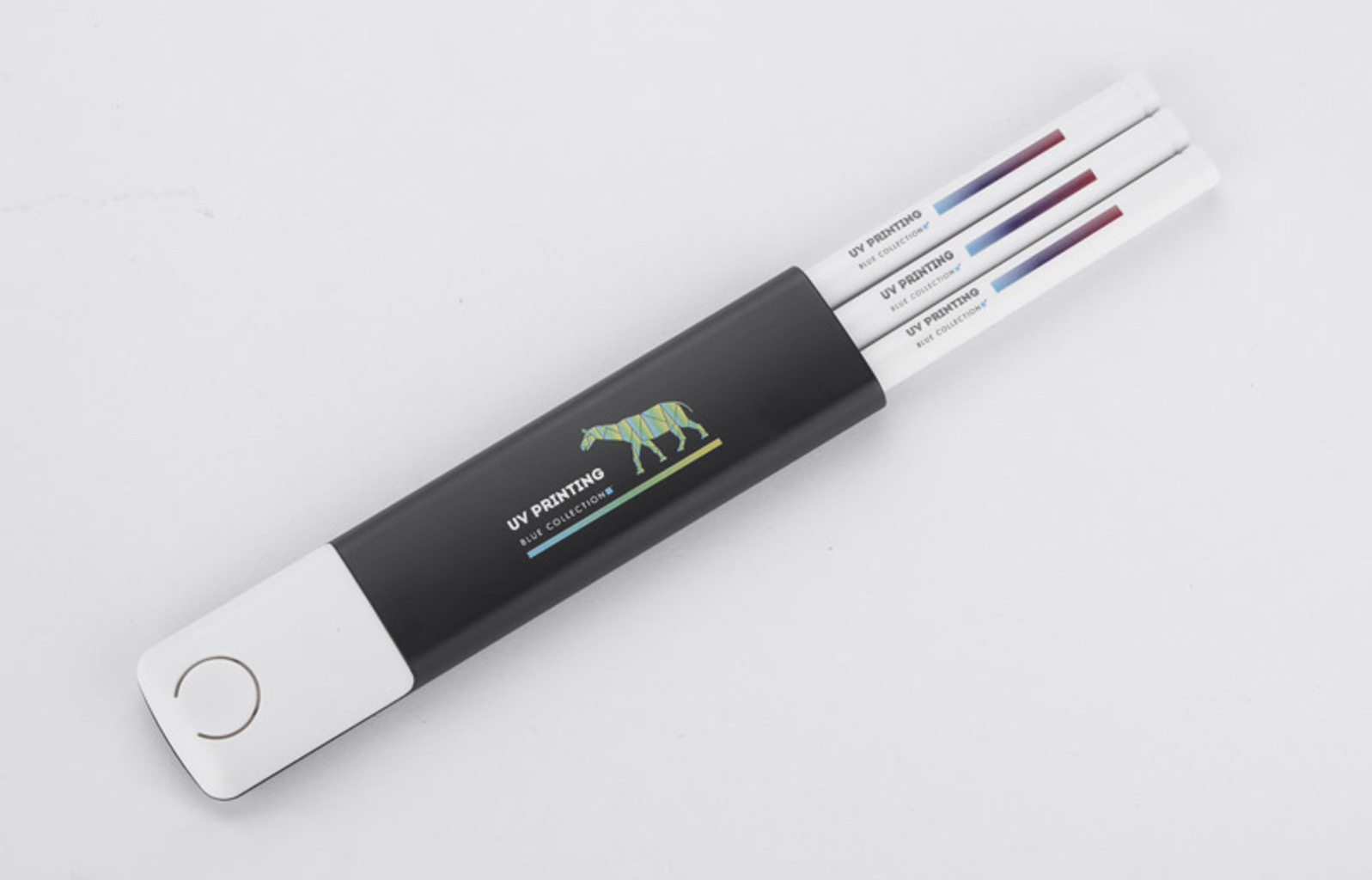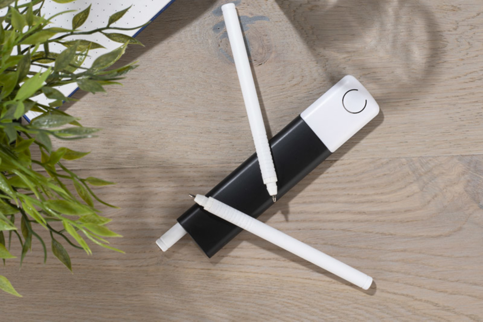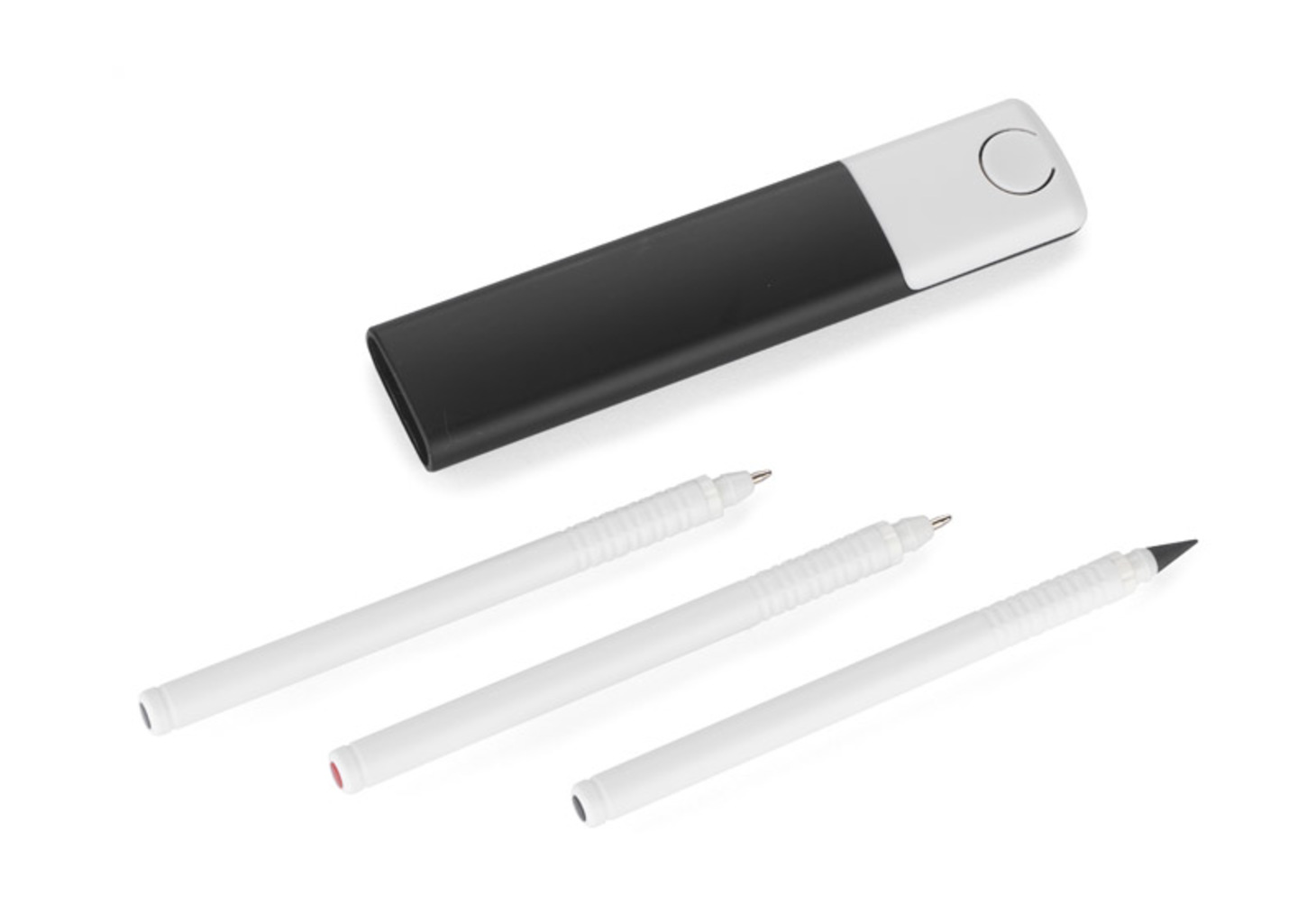 HOP je praktická psací souprava obsahující potřebné příslušenství zabalené v inovativním plastovém pouzdře. Pera umístěná uvnitř jsou držena speciálním mechanismem, který zabraňuje jejich vypadnutí. Stisknutím tlačítka ve spodní části pouzdra se zámek uvolní a umožní pero vyjmout. Sada obsahuje modré pero, červené pero a plnicí tužku, která nevyžaduje ořezávání. Celé je to vyrobeno z plastu, díky čemuž je sada mimořádně lehká. HOP je ideální dárek pro učitele, studenty a žáky, který se vejde do každé kabelky a batohu.