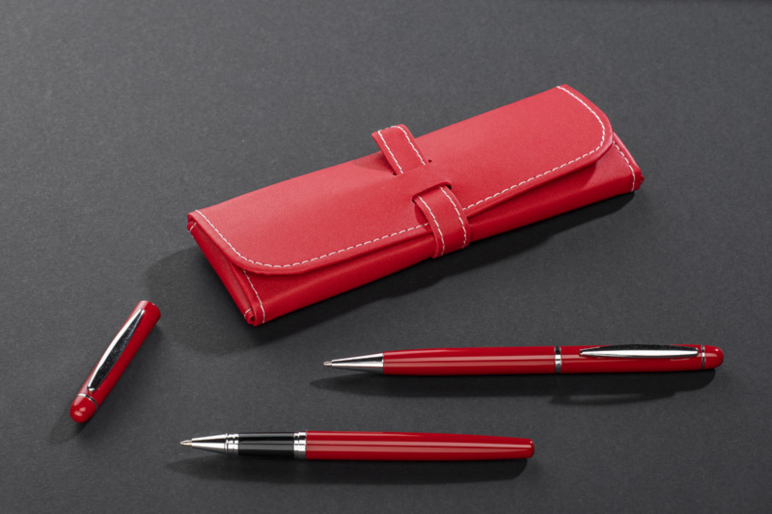 Elegantní psací souprava zabalená v pouzdře z materiálu podobného kůži (PU). Sada obsahuje kuličkové pero a roller. Na povrch psacích potřeb vám laserem vygravírujeme vaše logo. Logo lze vyrýt také na pouzdro.