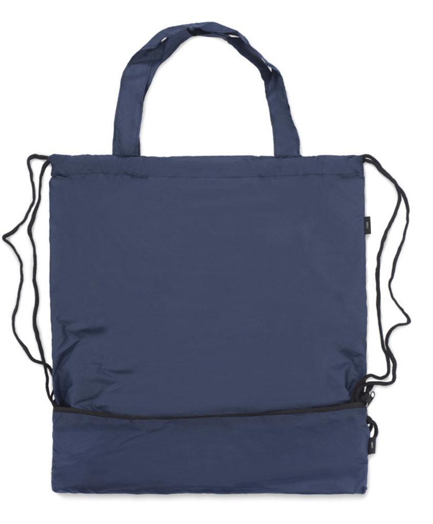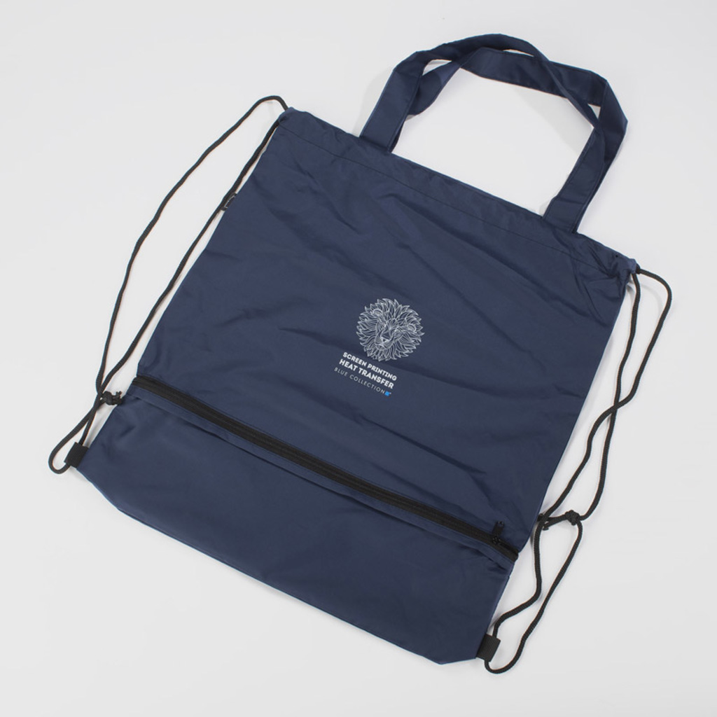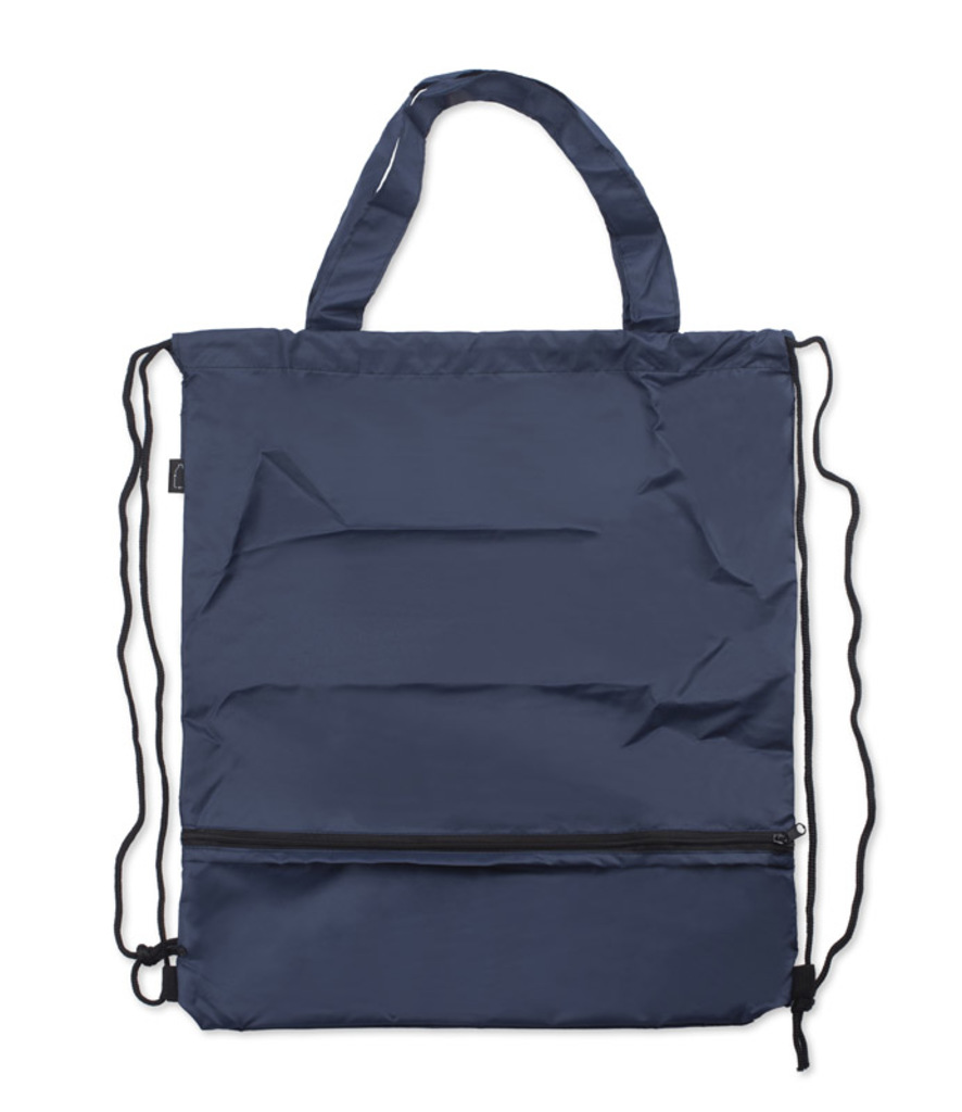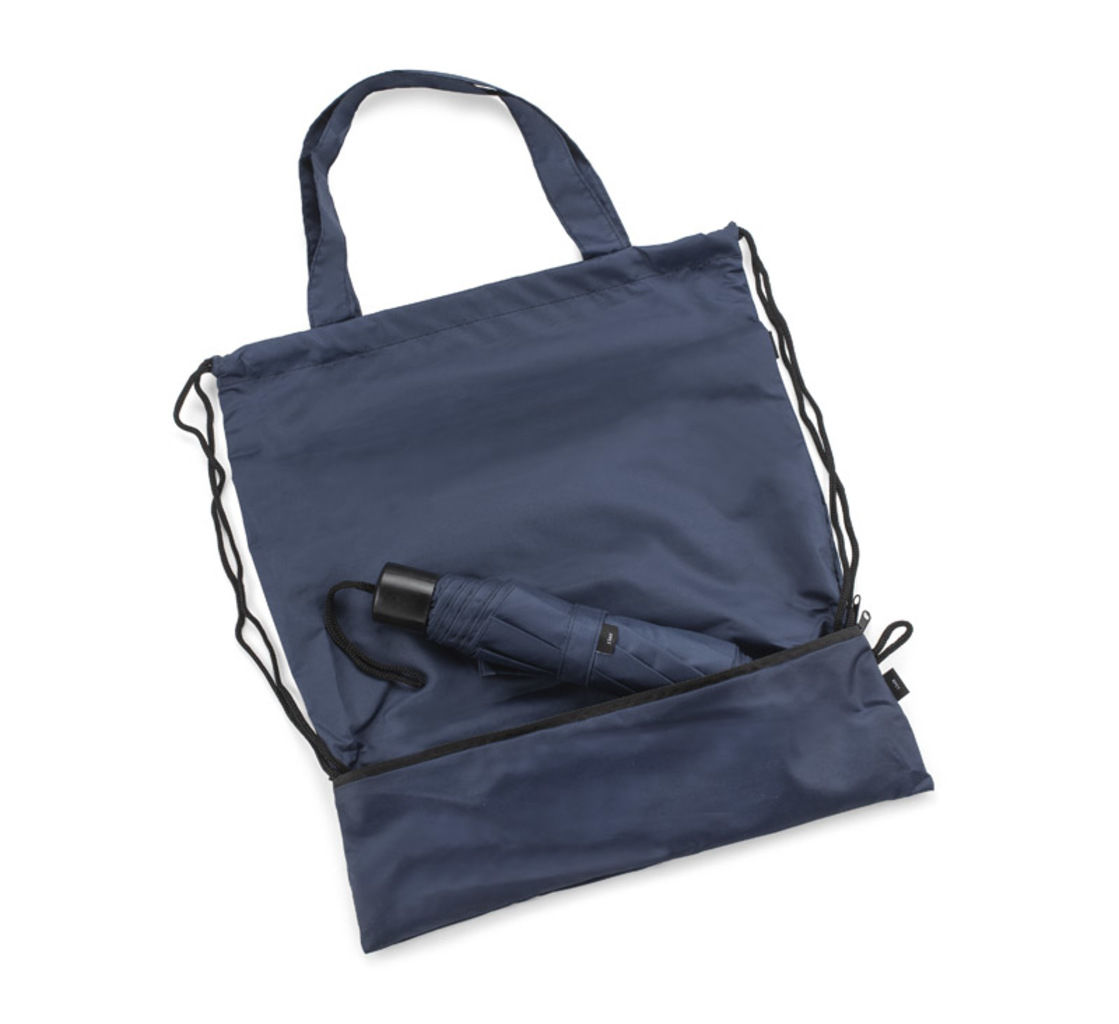 Stahovací taška na deštník RAINY je vyrobena z polyesteru RPET, takže je šetrnější k životnímu prostředí. Střed tašky je jednokomorový. Kromě tradičních šňůr má ještě ucha o délce 44 cm, takže ji lze použít i jako nákupní tašku. Ve spodní části tašky se nachází kapsa na zip, ve které je ukryt přiložený deštník, rovněž vyrobený z polyesteru RPET.