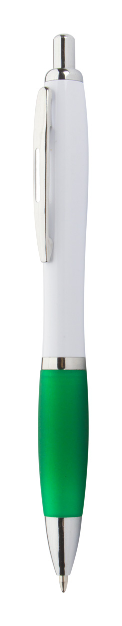 Kuličkové pero z recyklovaného ABS plastu s bílým tělem, barevným úchopem a chromovanými částmi. S modrou náplní.