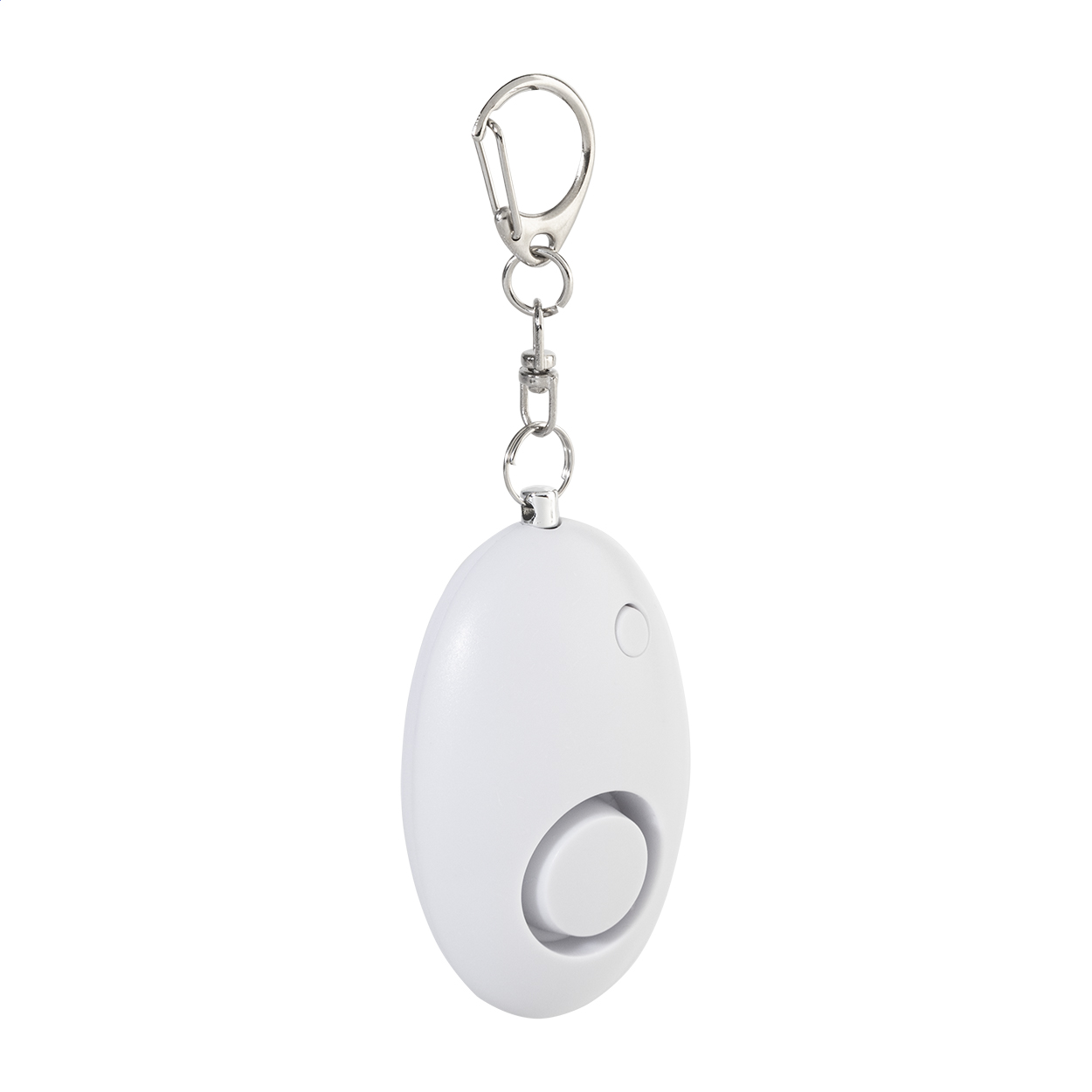 Osobní alarm z recyklovaného ABS materiálu s kovovou karabinou na klíče a 1 LED svítilnou. Alarm se aktivuje po zatažení za kolík. Hlasitost alarmu: cca 100 dB. S knoflíkovými bateriemi.