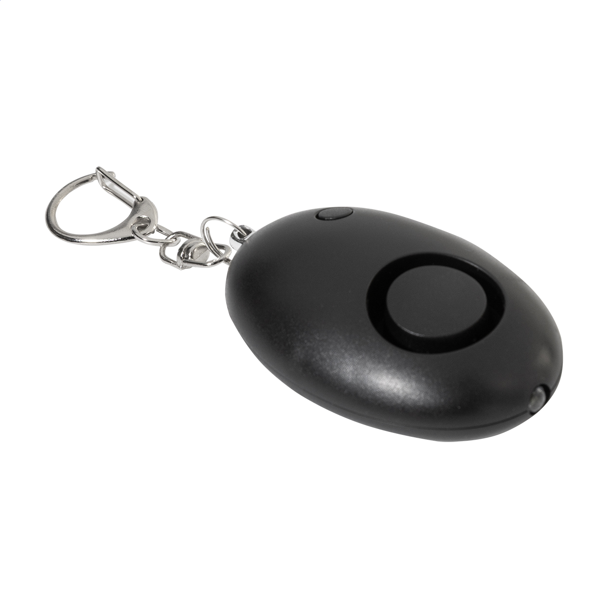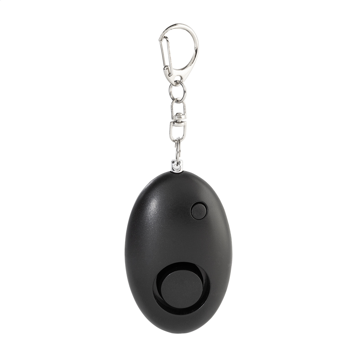 Osobní alarm z recyklovaného ABS materiálu s kovovou karabinou na klíče a 1 LED svítilnou. Alarm se aktivuje po zatažení za kolík. Hlasitost alarmu: cca 100 dB. S knoflíkovými bateriemi.