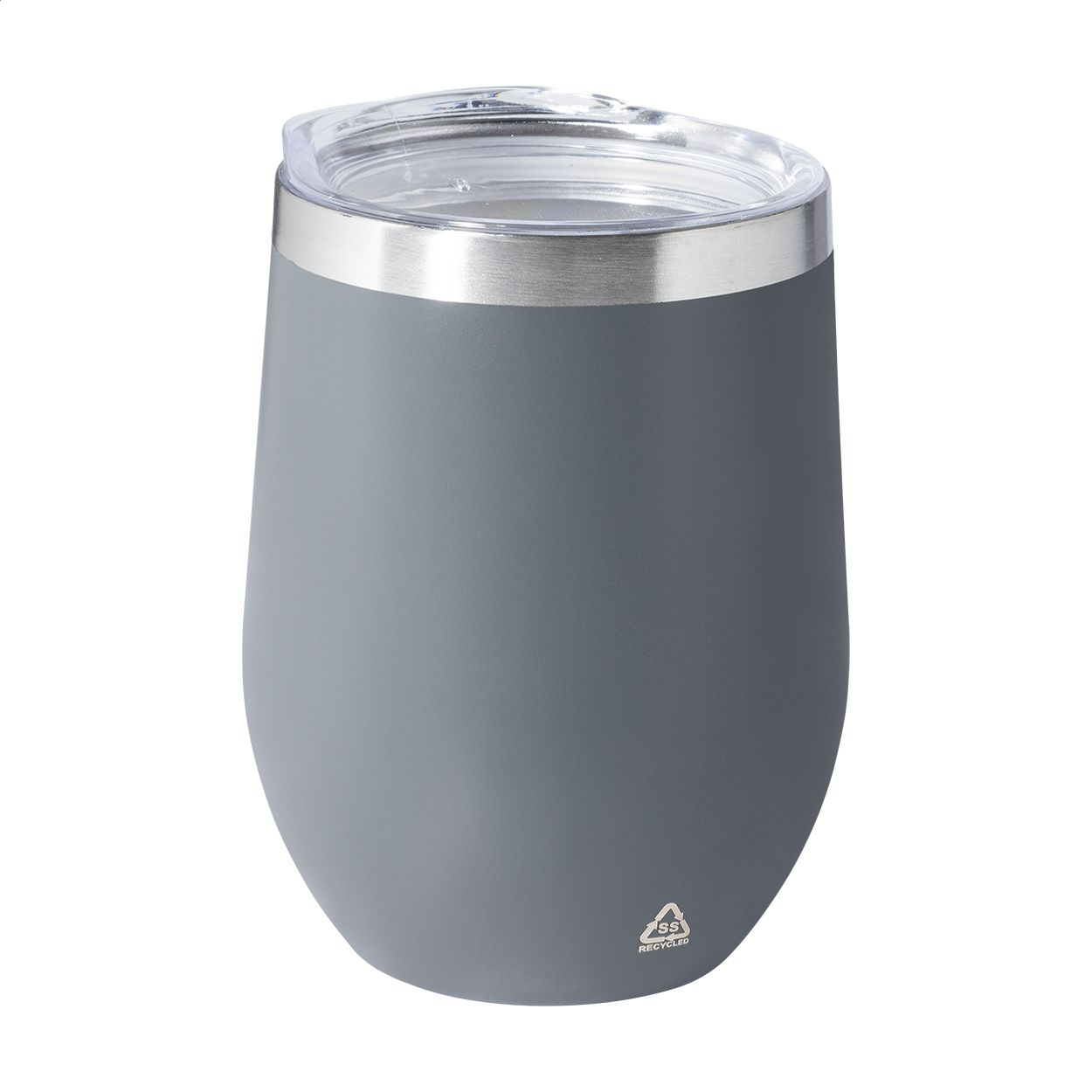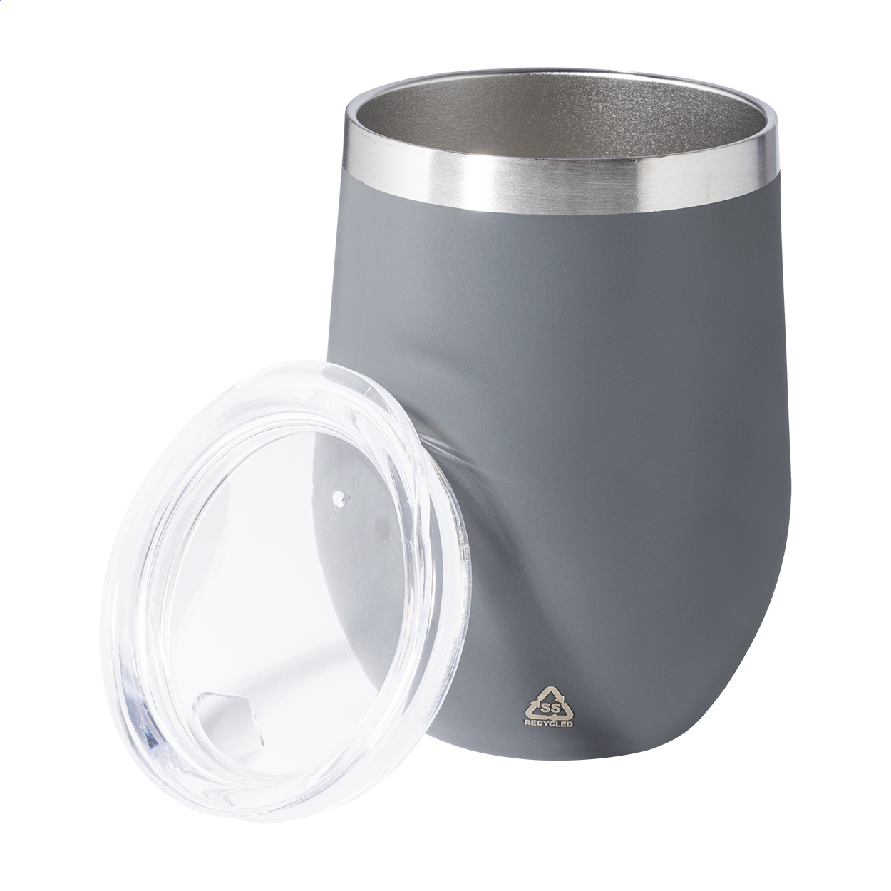 Dvoustěnný termo hrnek z recyklované nerezové oceli s plastovým víčkem na pití. 350 ml.