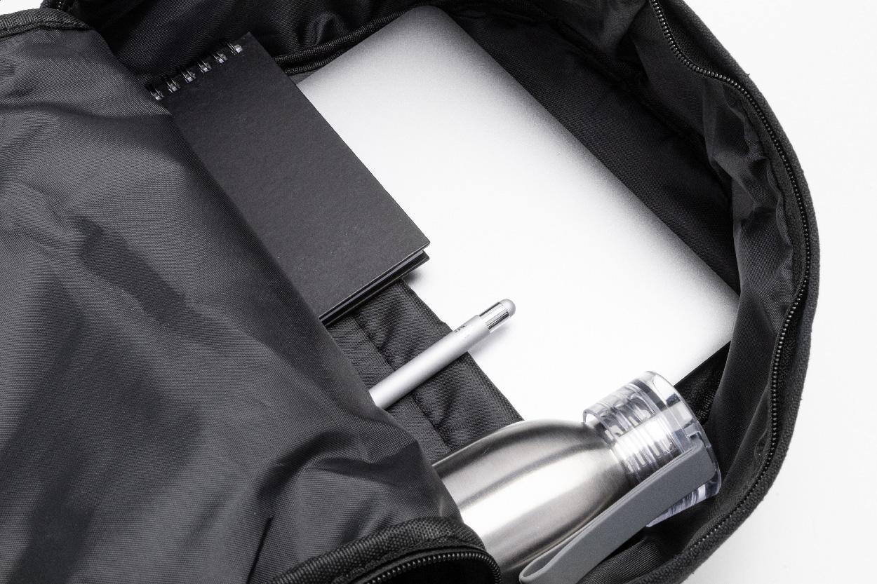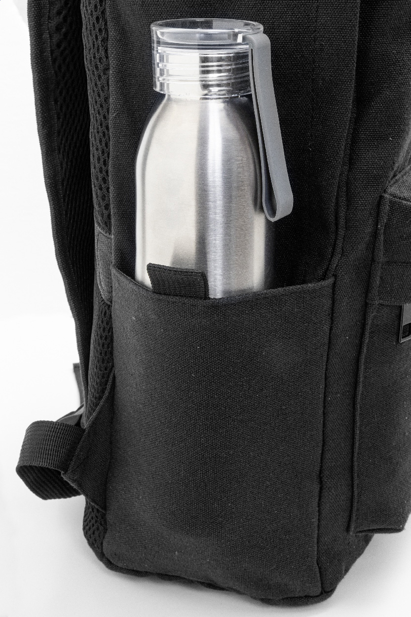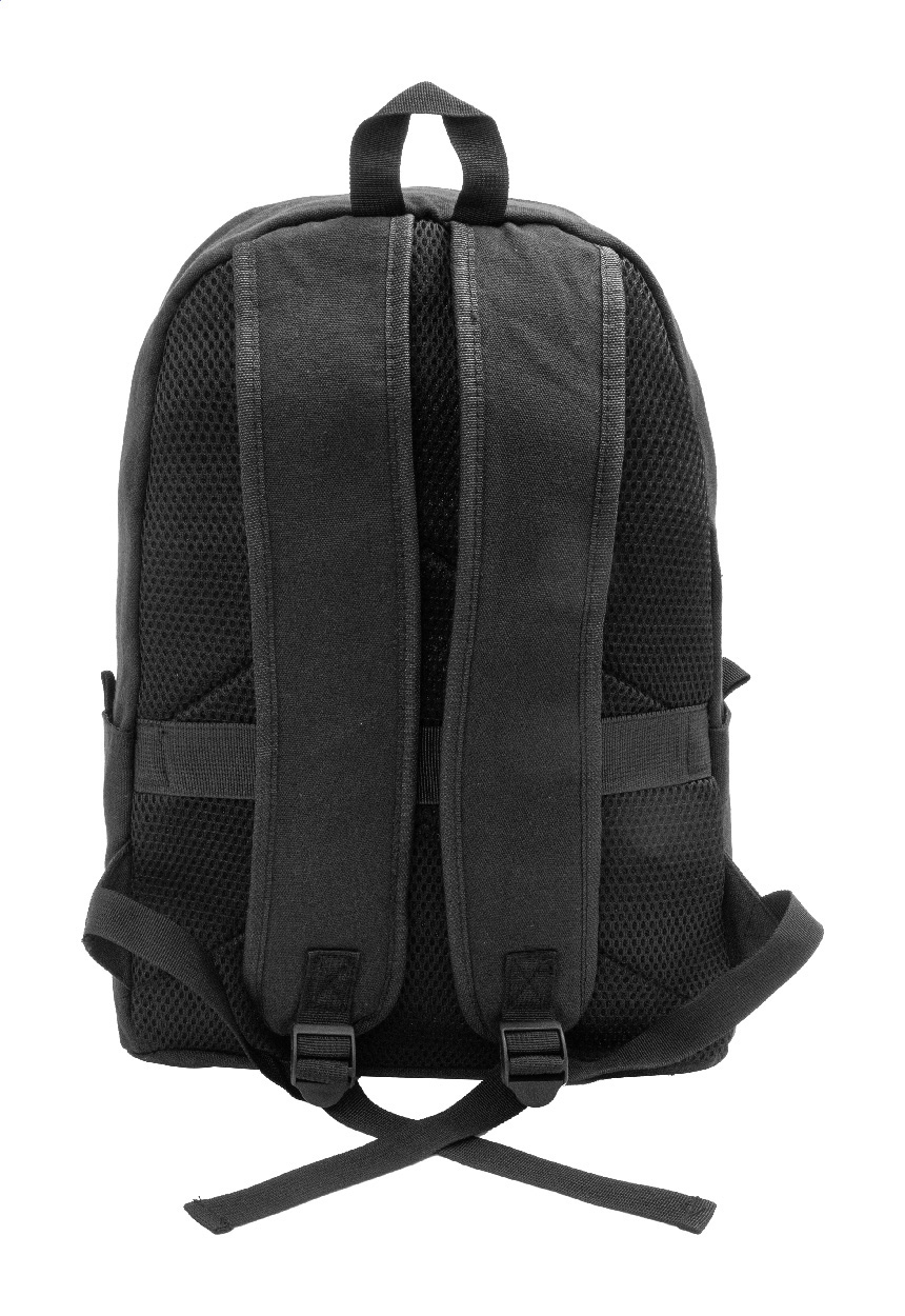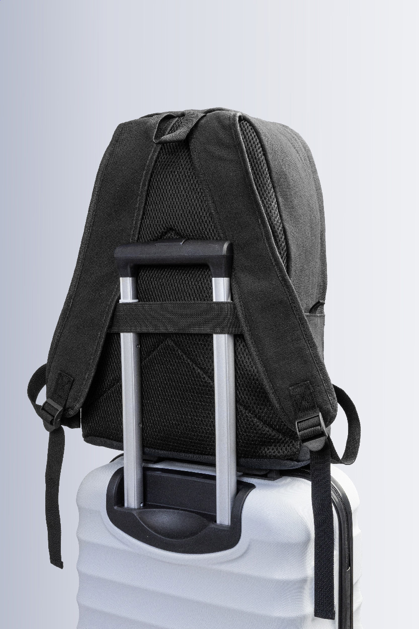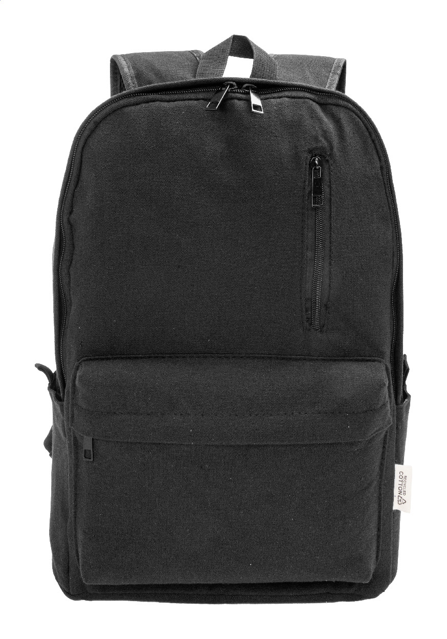 Recyklovaný plátěný batoh s hlavní přihrádkou na zip, polstrovanou přihrádkou na notebook (15"), 2 předními kapsami na zip, bočními kapsami, popruhem na kolečkách, polstrovanými zády a ramenními popruhy. 70% recyklované bavlny a 30% RPET polyesteru. S výrazným štítkem recyklované bavlny.