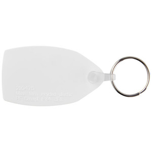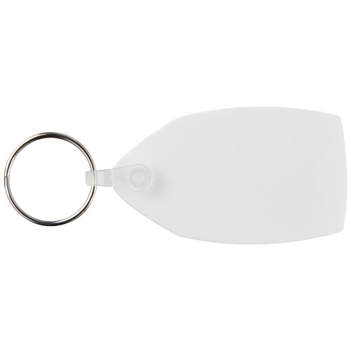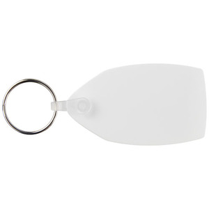 Bílá klíčenka obdélníkového tvaru s kovovým kroužkem. Kovový kroužek má plochý profil, který je ideální pro korespondenci.