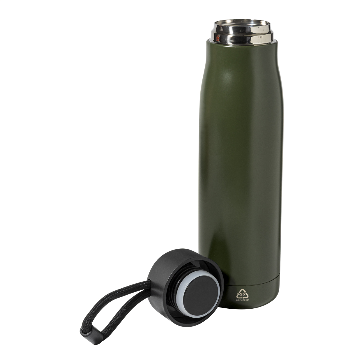 Dvoustěnná, vakuově izolovaná láhev z recyklované nerezové oceli s PP víčkem a integrovaným poutkem na nošení se šňůrkou. 500 ml.