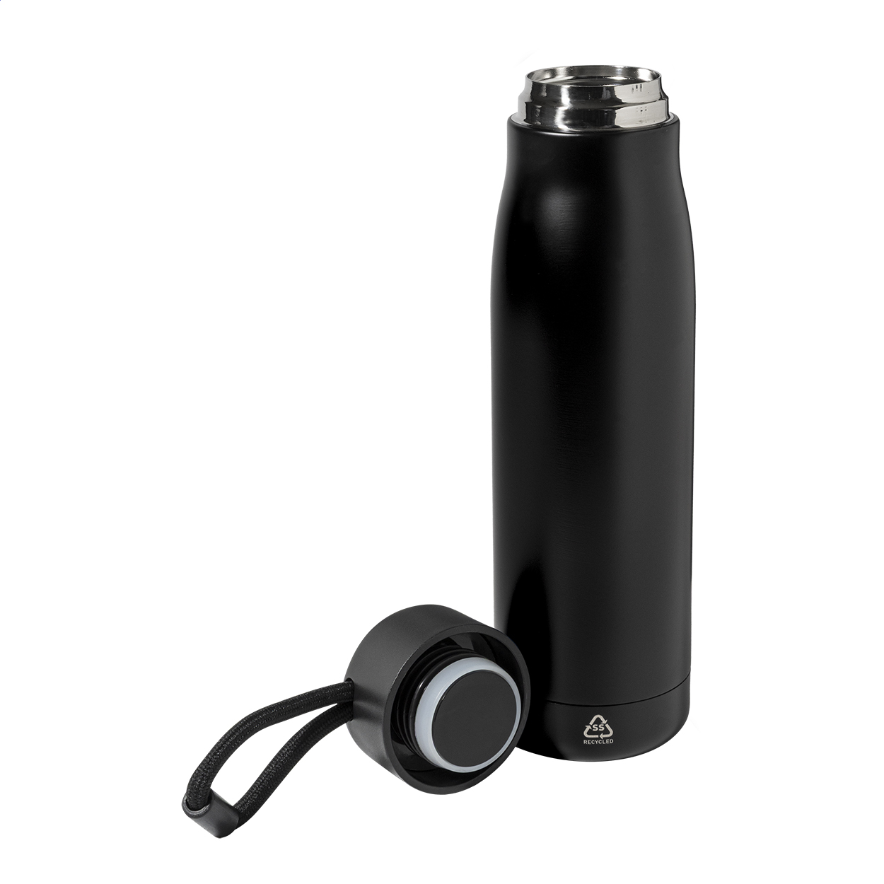 Dvoustěnná, vakuově izolovaná láhev z recyklované nerezové oceli s PP víčkem a integrovaným poutkem na nošení se šňůrkou. 500 ml.