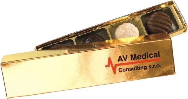 mléčná čokoláda s oříškovou náplní, lepenka se zlatou a stříbrnou laminací, 170 x 40 x 20 mm, min. 100 ks