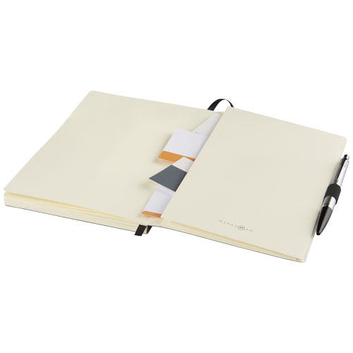 Zápisník s měkkou flexibilní obálkou (velikost A5) s integrovaným elastickým uzávěrem, stužkou na založení stránky, smyčkou na pero, kapsou na dokumenty na vnitřní zadní obálky a 80 listy (80g papíru) krémového papíru. Baleno v černém pouzdru.