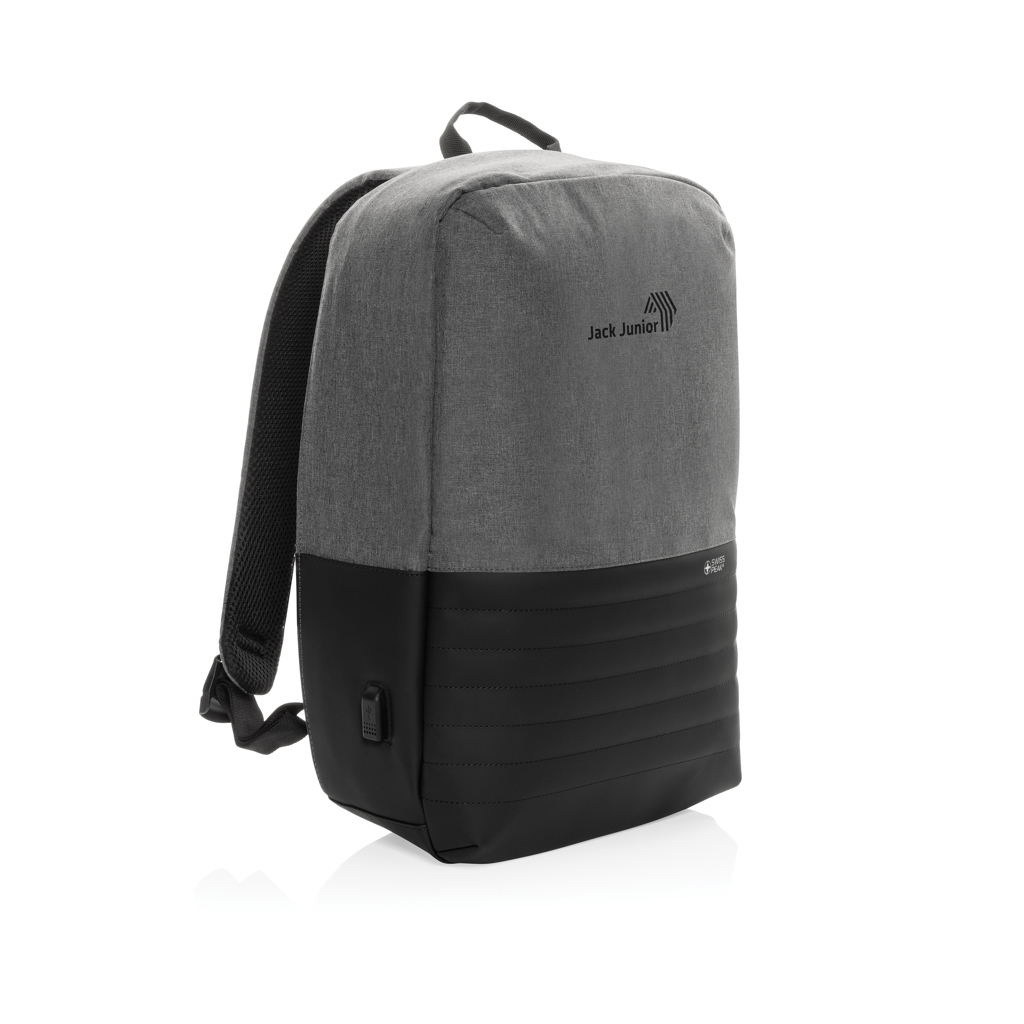 Batoh Swiss Peak s nedobytným zapínáním skrytým v zadní části zajistí bezpečnost všech uložených cenností. Vnitřní část obsahuje oddíl na 15,6" notebook a tablet, RFID kapsy pro uložení dokladů. Integrovaný USB port pro snadné nabíjení telefonu z powerbanky, kterou lze uložit uvnitř batohu. Skrytá kapsa na zadní části. Vyrobeno z recyklovaného polyesteru AWARE™. Na výrobu bylo využito 20,8 500ml PET lahví a bylo uspořeno 12,4 litrů vody. Z výtěžku každého prodaného kusu je navíc přispěno 2 % na podporu iniciativy Water.org.