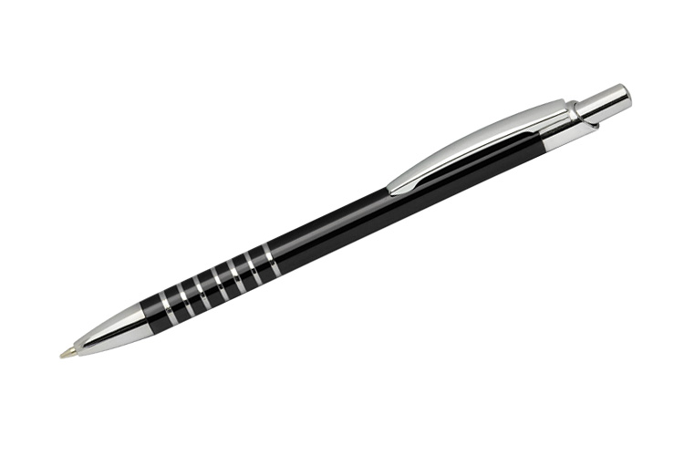 Kovová kuličková propiska v několika barvách s chromovými doplňky (špička, tlačítko, spona a proužky na těle) a Touch pen u tuhy. Náplň pera je modrá.
