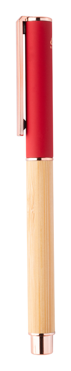 Roller pero z bambusu a recyklovaného hliníku s pogumovaným uzávěrem a detaily z růžového zlata. Se speciální povrchovou úpravou pro zrcadlové laserové gravírování v barvě růžového zlata. S modrou náplní.