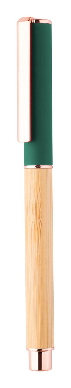 Roller pero z bambusu a recyklovaného hliníku s pogumovaným uzávěrem a detaily z růžového zlata. Se speciální povrchovou úpravou pro zrcadlové laserové gravírování v barvě růžového zlata. S modrou náplní.
