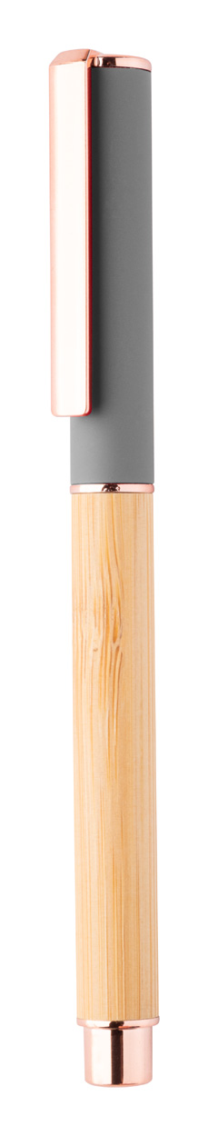 Roller pero z bambusu a recyklovaného hliníku s pogumovaným uzávěrem a detaily z růžového zlata. Se speciální povrchovou úpravou pro zrcadlové laserové gravírování v barvě růžového zlata. S modrou náplní.