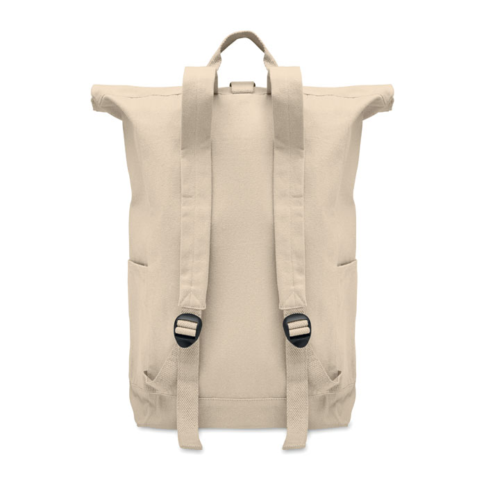 Rolovací batoh se zapínáním na suchý zip z 390g recyklované bavlny (80 %) a recyklovaného polyesteru (20 %). Přední kapsa na zip.