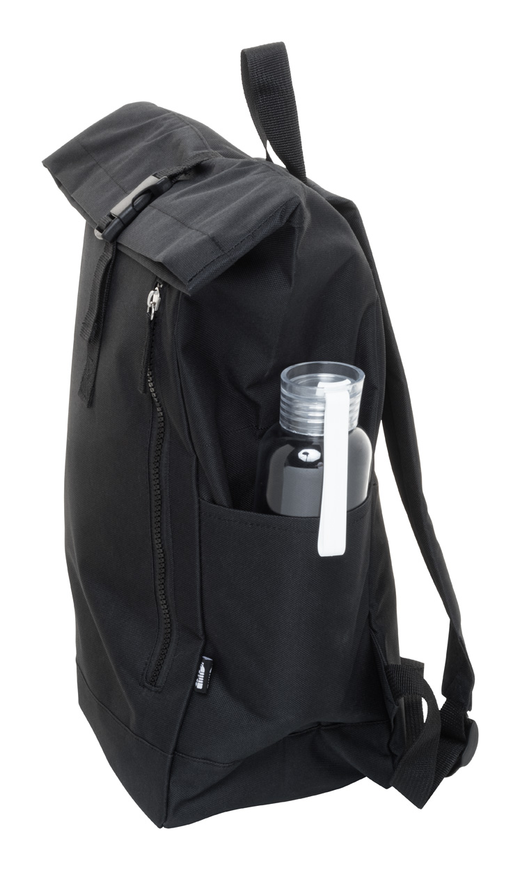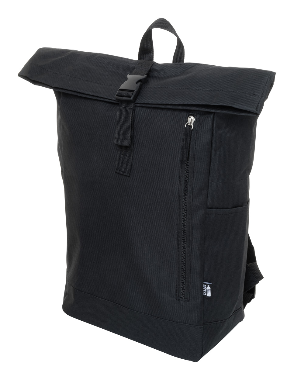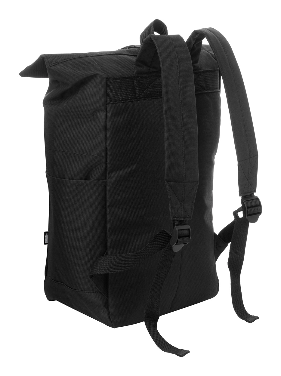 Rolovací batoh RPET se zapínáním na přezku, přihrádkou na notebook (14") a přední kapsou na zip. S polstrovanými zády a ramenními popruhy. Polyester 600D RPET s výrazným štítkem RPET.