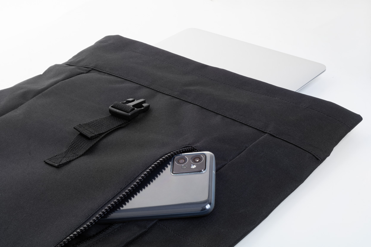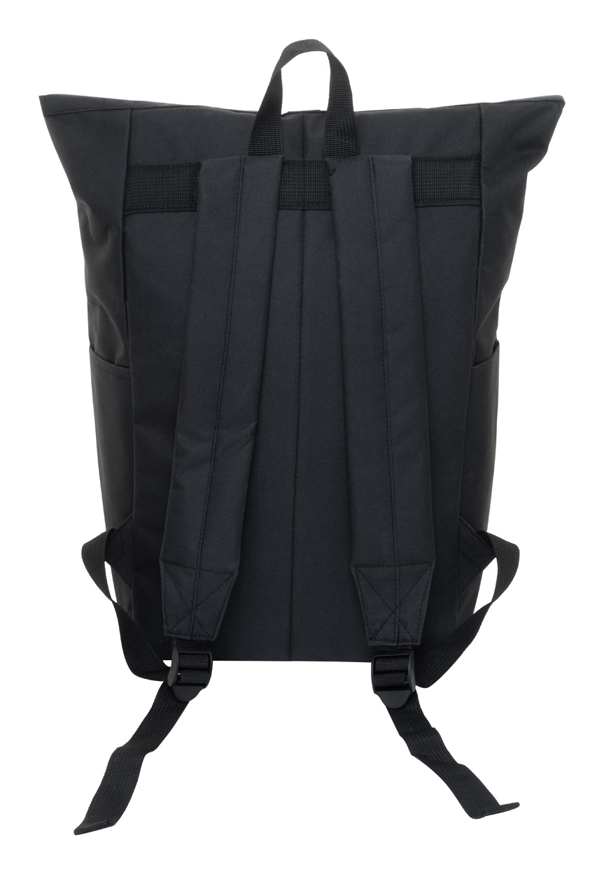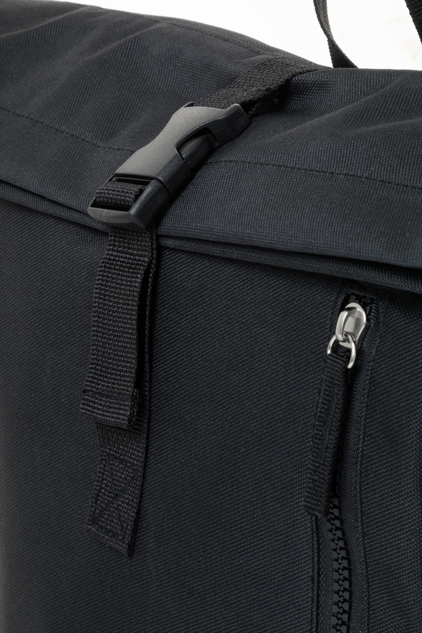 Rolovací batoh RPET se zapínáním na přezku, přihrádkou na notebook (14") a přední kapsou na zip. S polstrovanými zády a ramenními popruhy. Polyester 600D RPET s výrazným štítkem RPET.