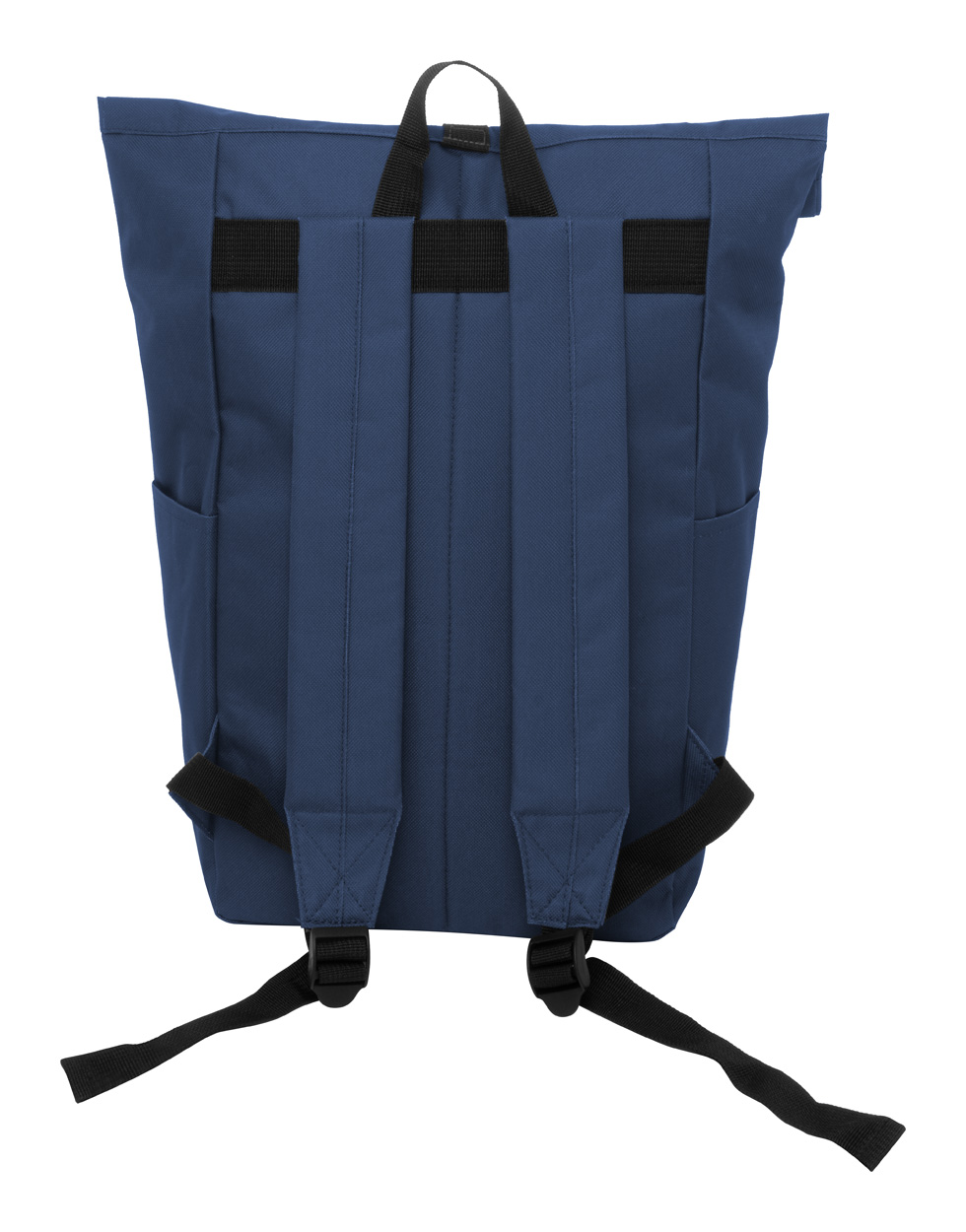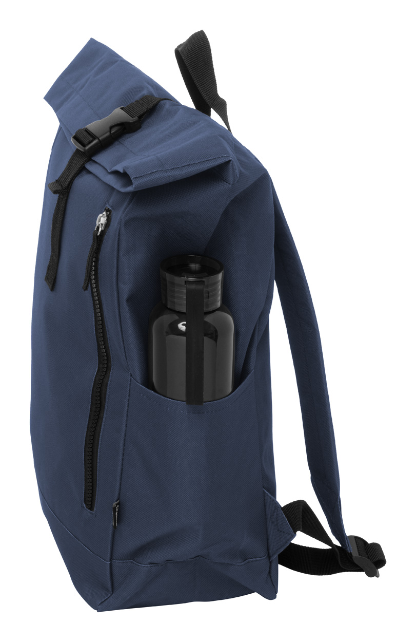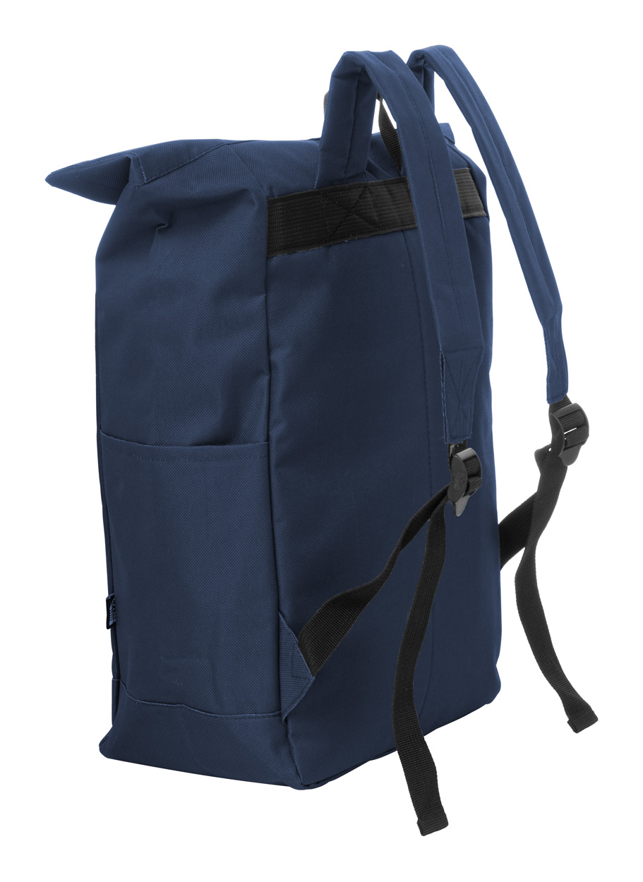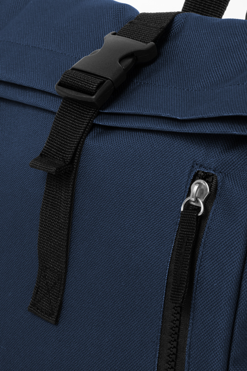 Rolovací batoh RPET se zapínáním na přezku, přihrádkou na notebook (14") a přední kapsou na zip. S polstrovanými zády a ramenními popruhy. Polyester 600D RPET s výrazným štítkem RPET.