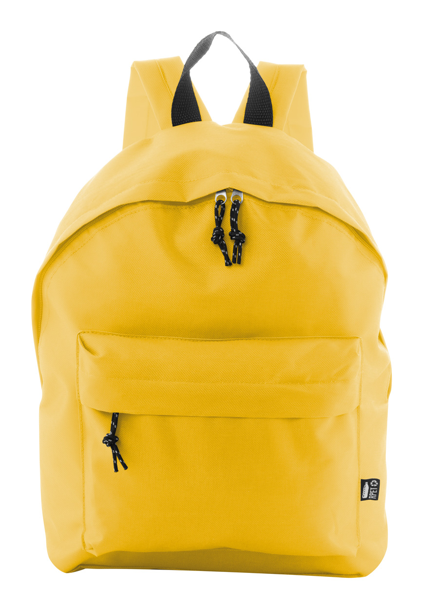 RPET batoh s hlavním prostorem na zip, přední kapsou na zip, polstrovanými zády a ramenními popruhy. Polyester 600D RPET, s výrazným štítkem RPET.