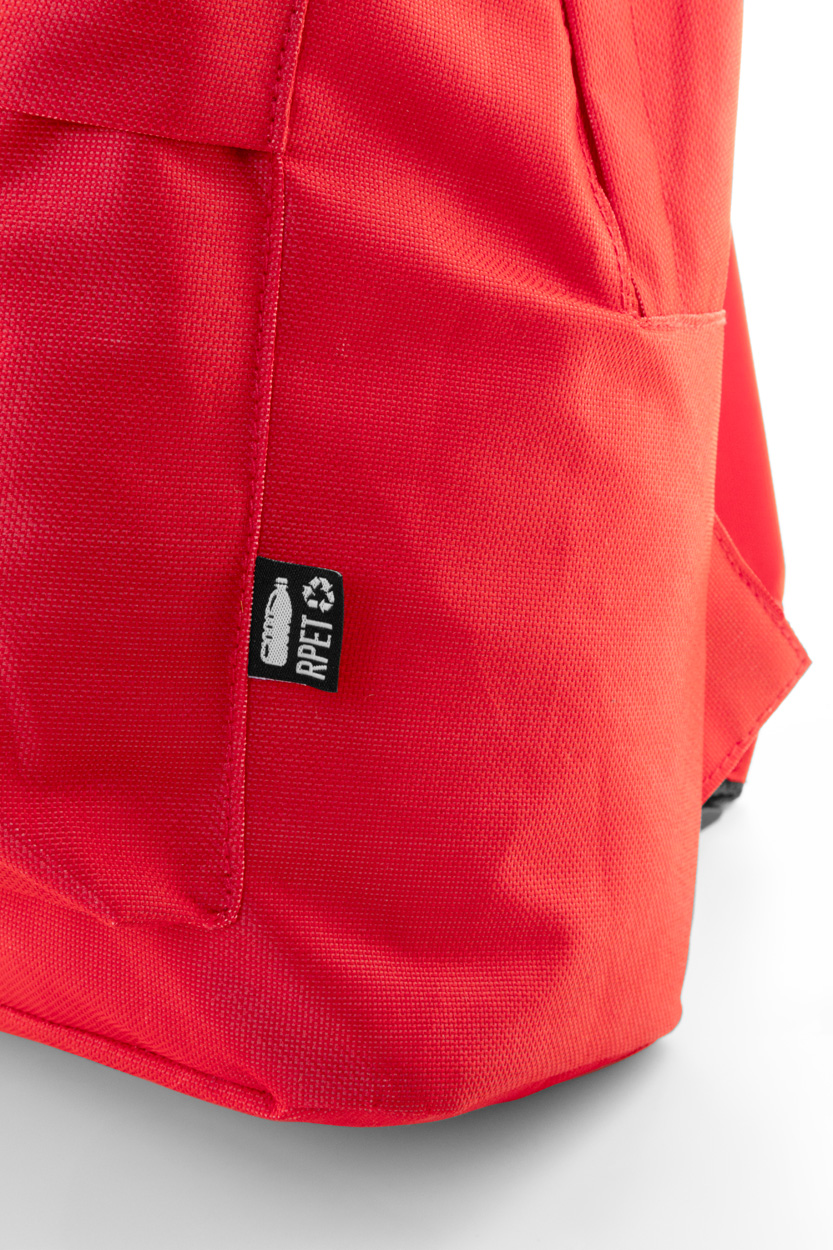 RPET batoh s hlavním prostorem na zip, přední kapsou na zip, polstrovanými zády a ramenními popruhy. Polyester 600D RPET, s výrazným štítkem RPET.