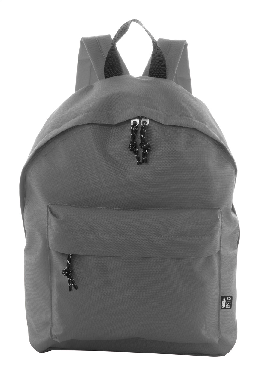 RPET batoh s hlavním prostorem na zip, přední kapsou na zip, polstrovanými zády a ramenními popruhy. Polyester 600D RPET, s výrazným štítkem RPET.