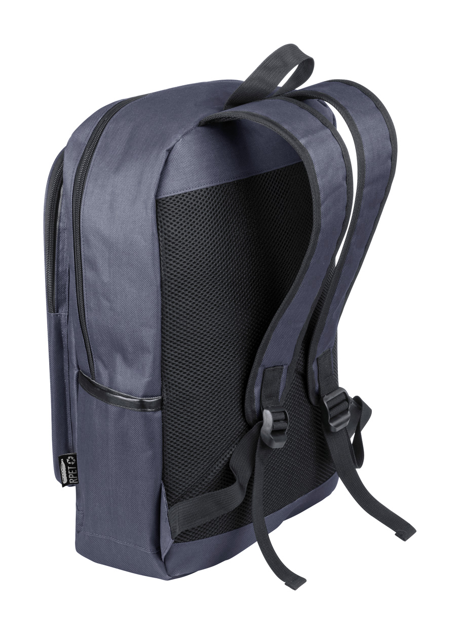 Batoh RPET s hlavním oddílem na zip, 2 předními kapsami na zip, bočními kapsami a polstrovanou přihrádkou na notebook (15"). S polstrovanými zády a ramenními popruhy. Polyester 600D RPET, s výrazným štítkem RPET.