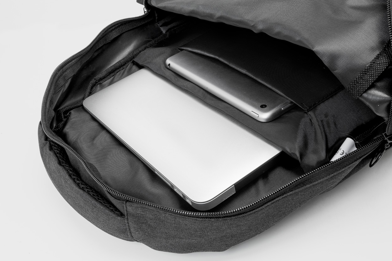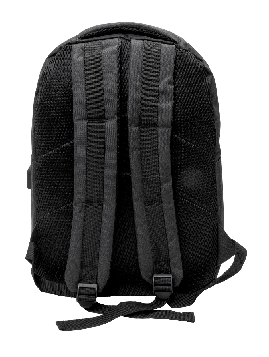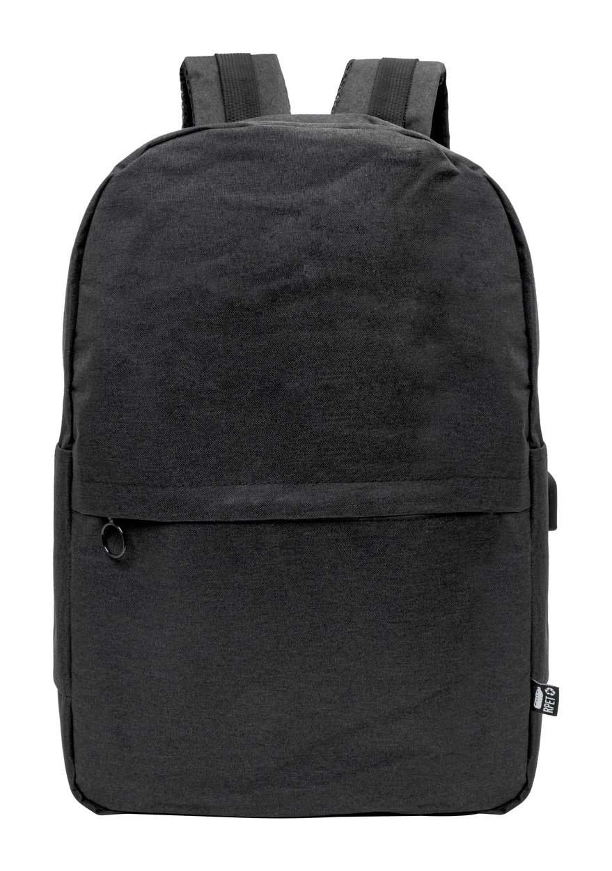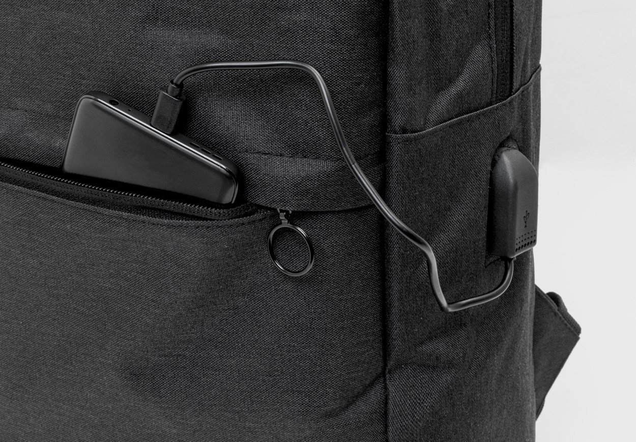 Batoh s přihrádkami na zip, polstrovaným prostorem pro notebook (15 ") a tablet (10"), polstrovanými zady a ramenními popruhy. Se zabudovaným USB připojením pro power banky. 600D RPET polyester, s etiketou s označením RPET.