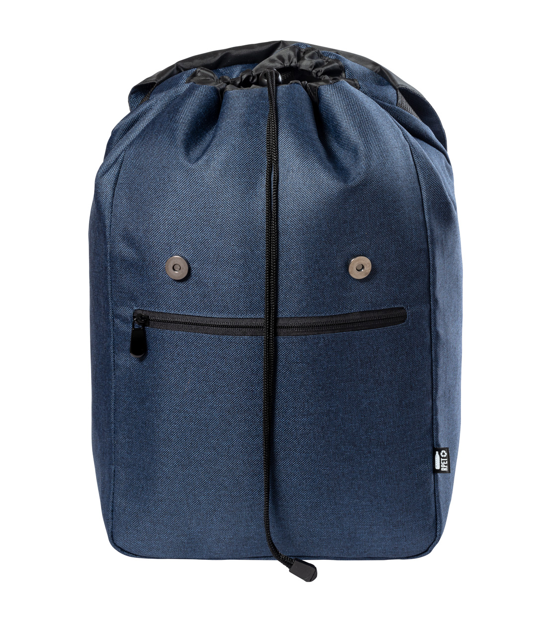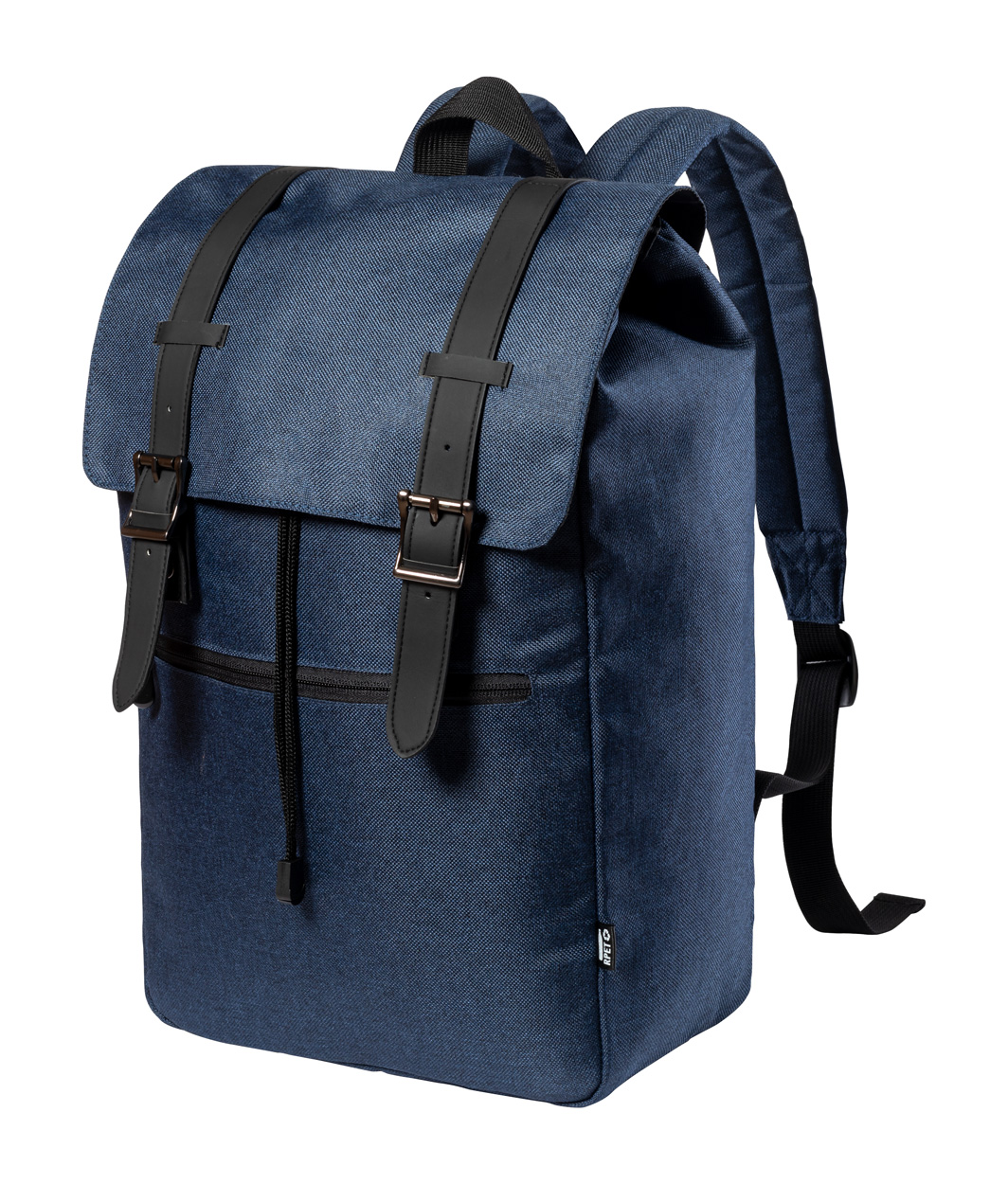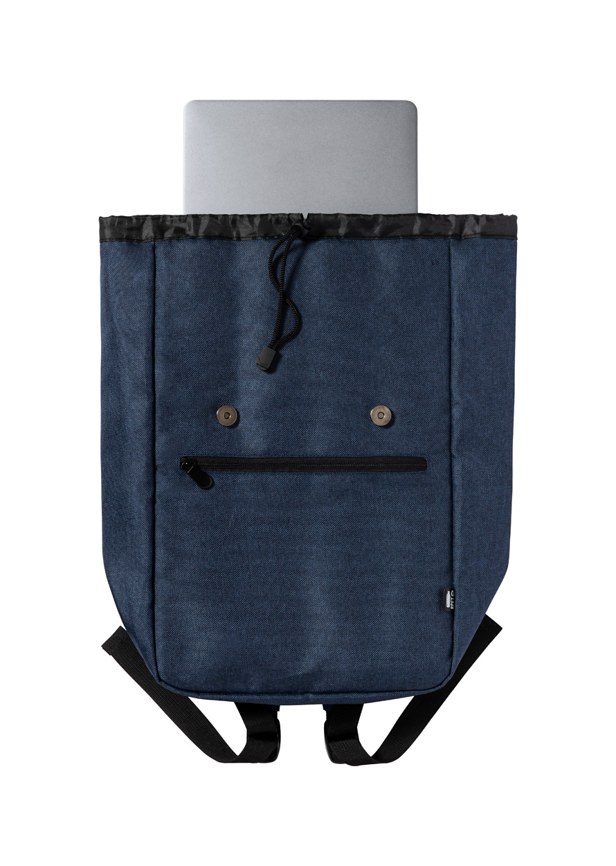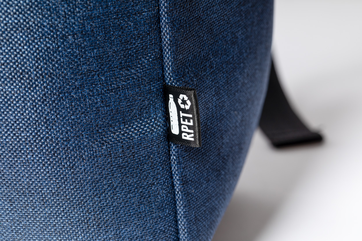 RPET batoh s polstrovanou přihrádkou na notebook (15") a tablet (12"), přední kapsou na zip, polstrovanými zády a ramenními popruhy. Hlavní komora se stahovací šňůrkou a magnetickým zapínáním na knoflík. Polyester 300D RPET. S výrazným štítkem RPET.