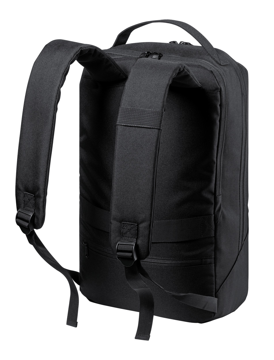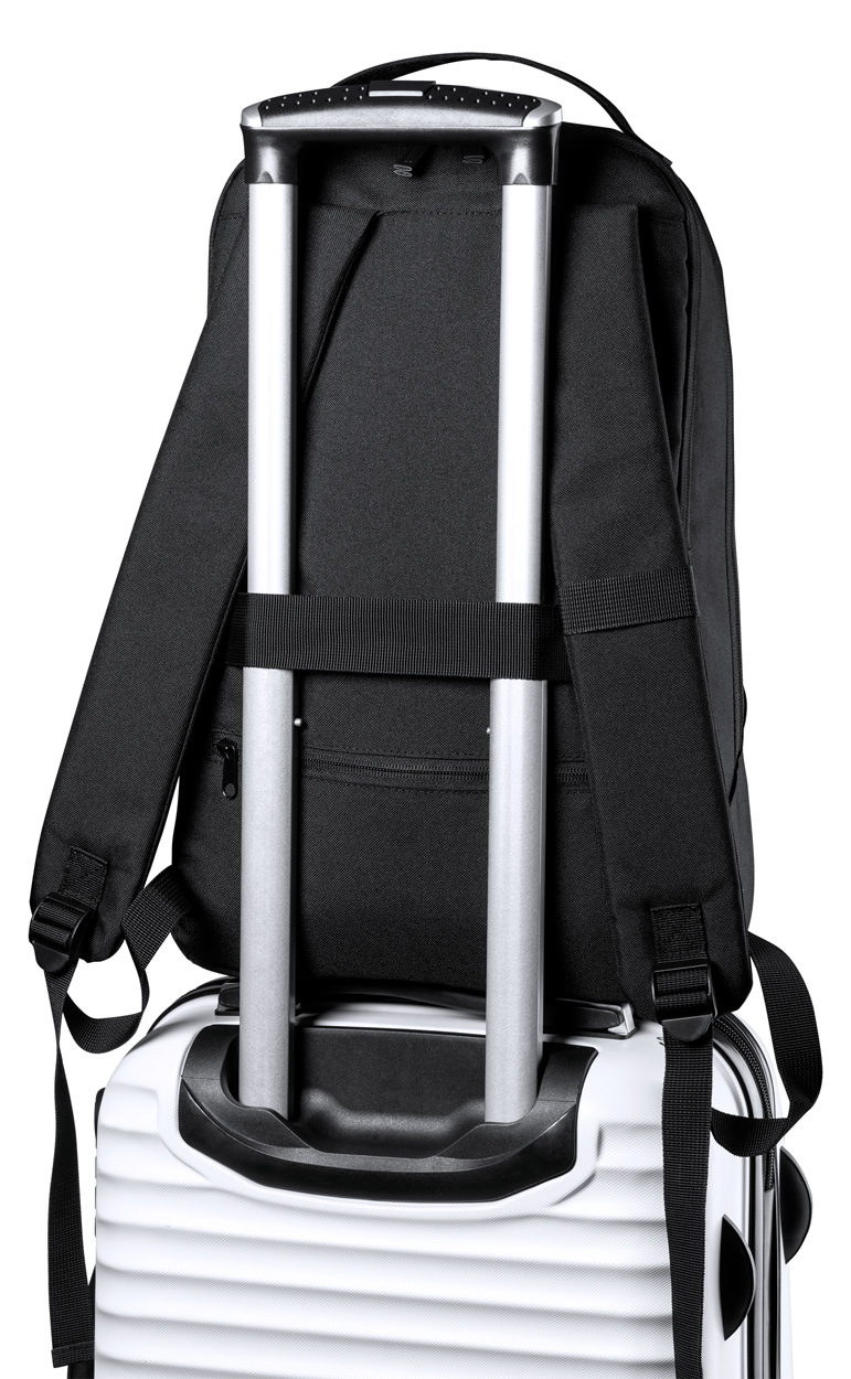 Vodotěsný batoh RPET s přihrádkami na zip, polstrovanou přihrádkou na notebook (15") a tablet (10"), popruhem na vozík, skrytou kapsou proti krádeži, ergonomickými zády a ramenními popruhy. 600D RPET polyester s výrazným štítkem RPET.