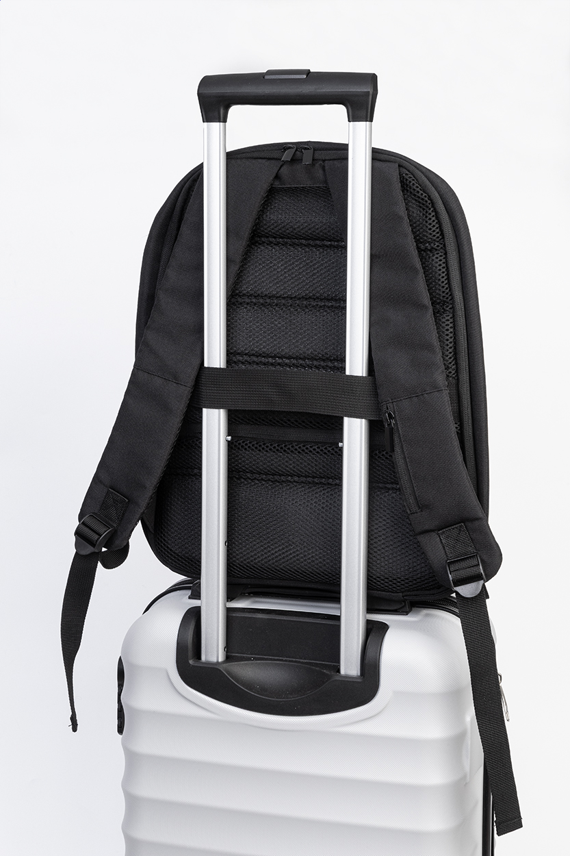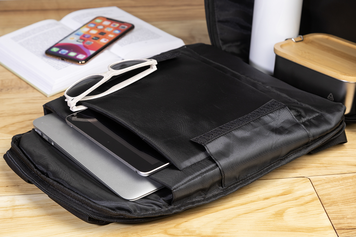 Batoh z RPET s ochranou proti krádeži s přihrádkou na zip, polstrovanou přihrádkou na notebook (15") a tablet (12"), popruhem na kufr, polstrovanými zády a ramenními popruhy. Se skrytou kapsou proti krádeži. Polyester 300D RPET. S výrazným štítkem RPET.