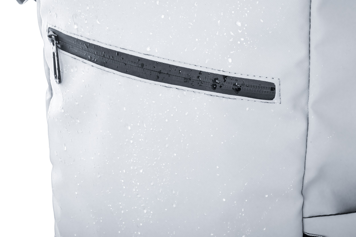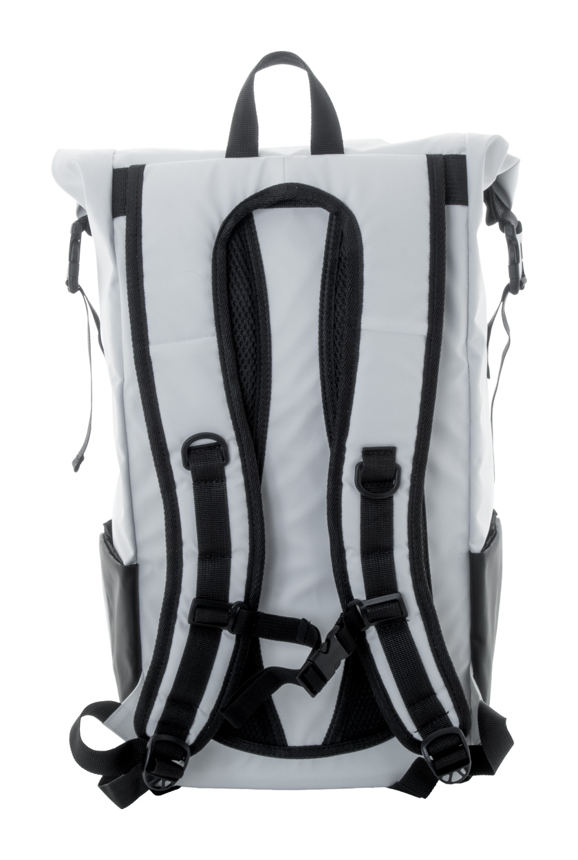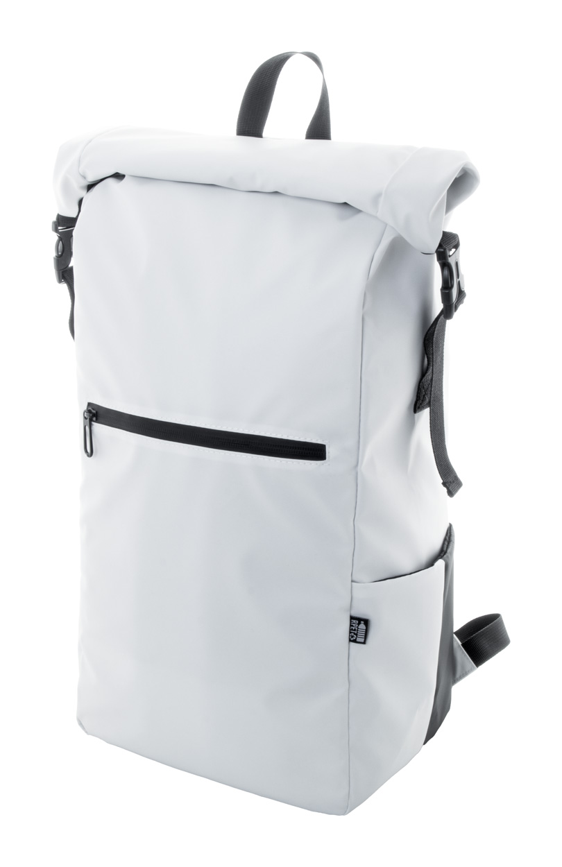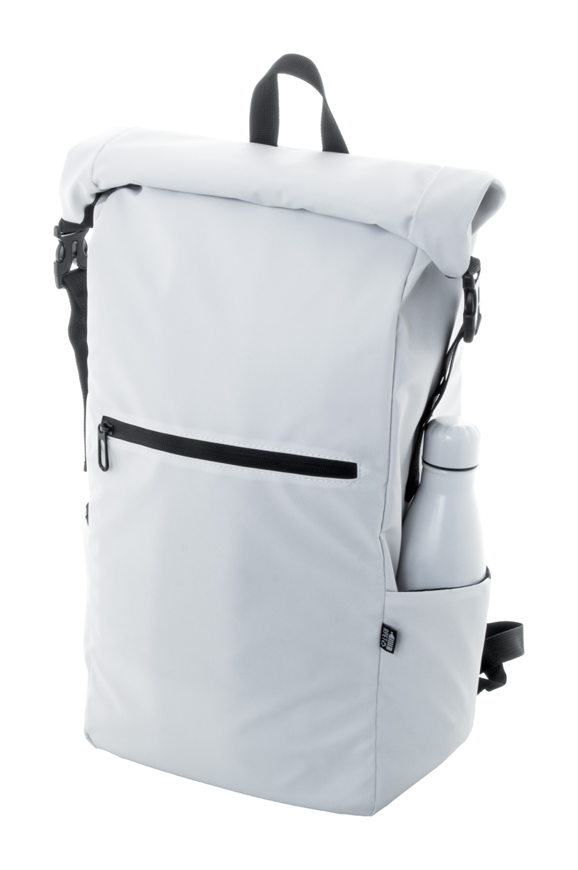 Vodotěsný rolovací batoh z RPET se zapínáním na přezku a suchý zip, polstrovaná přihrádka na notebook (16") a tablet (10"), přední kapsa na zip, boční kapsy, polstrovaná záda a ramenní popruhy. Polyester 600D RPET potažený PU, s výrazným štítkem RPET.