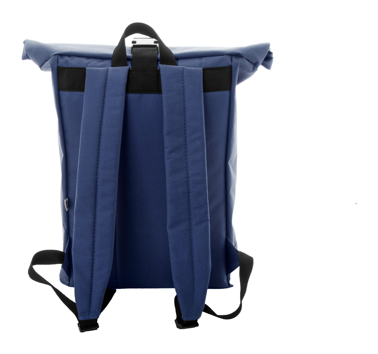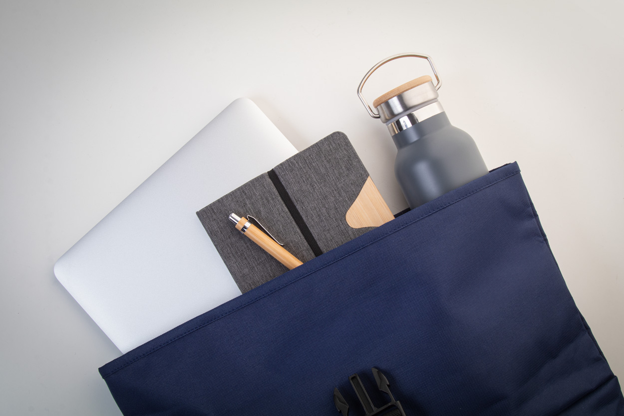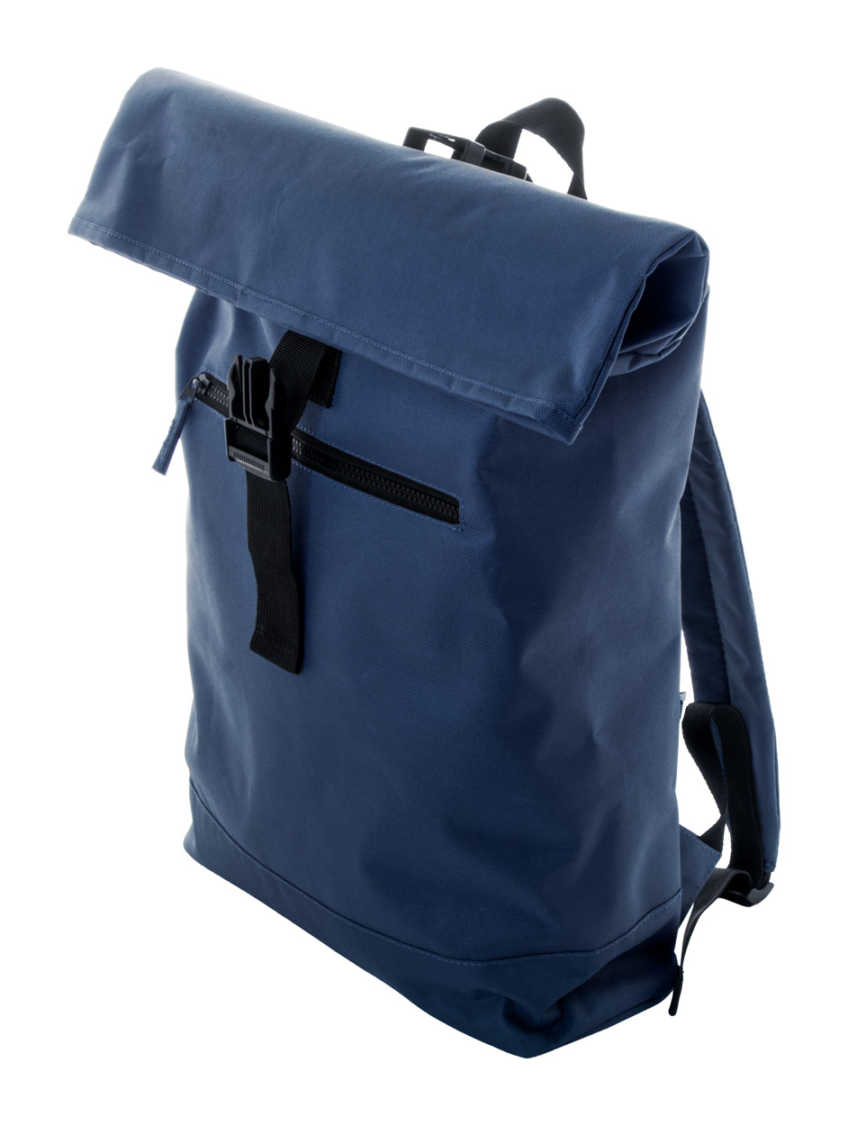 Rolovací batoh RPET se zapínáním na přezku, přední kapsa na zip, polstrovaná přihrádka na notebook (15"), polstrovaná záda a ramenní popruhy. Polyester 600D RPET s výrazným štítkem RPET.