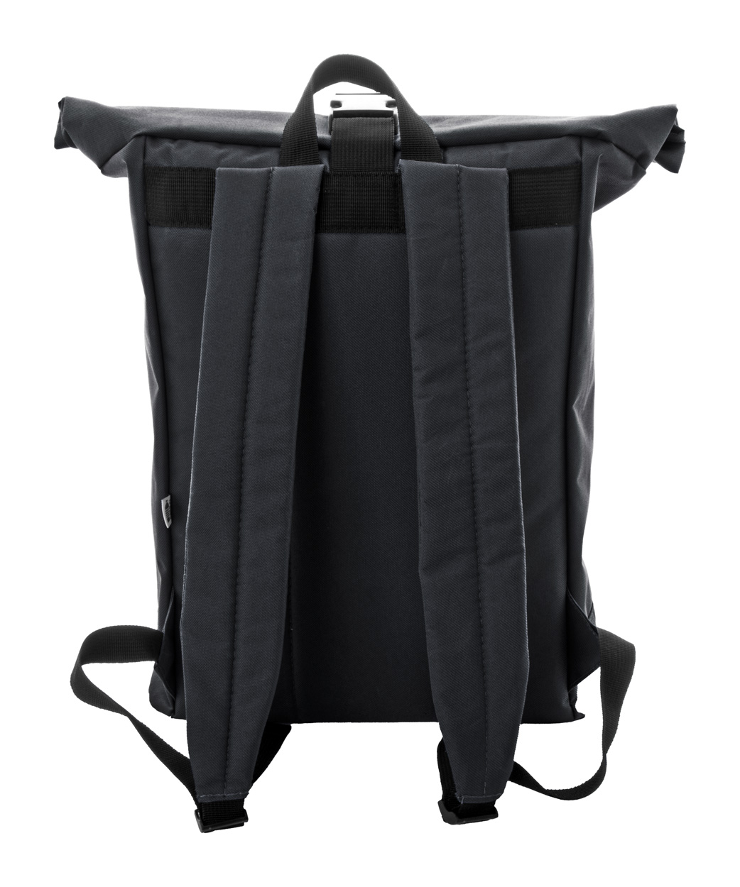 Rolovací batoh RPET se zapínáním na přezku, přední kapsa na zip, polstrovaná přihrádka na notebook (15"), polstrovaná záda a ramenní popruhy. Polyester 600D RPET s výrazným štítkem RPET.